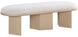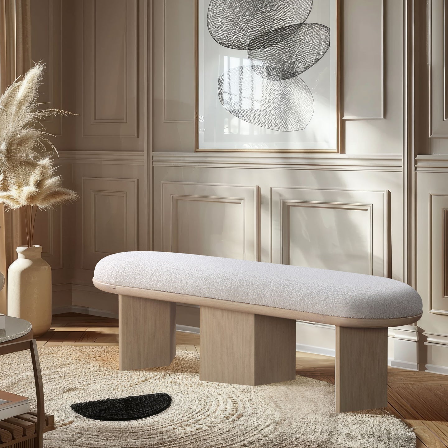 Immerse your entryway, living room, or bedroom in elegance with our stunning Wilshire boucle fabric bench. The rich solid wood natural oak finish triple-columnar base not only offers stability but also adds a touch of warmth to the bench's art deco design. Sink into the plushness of this bench, inviting you to relax in comfort and style. Place this pretty bench wherever you need extra seating - it's an ideal blend of form and function.