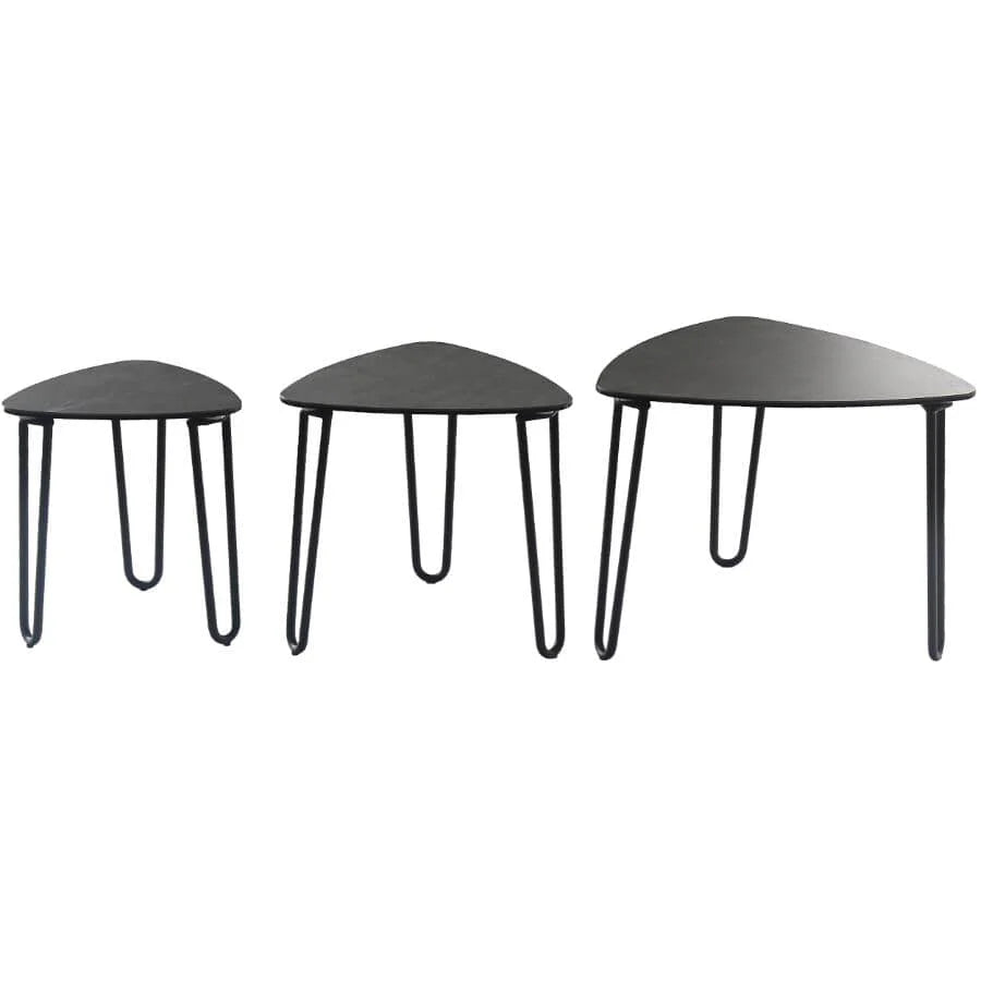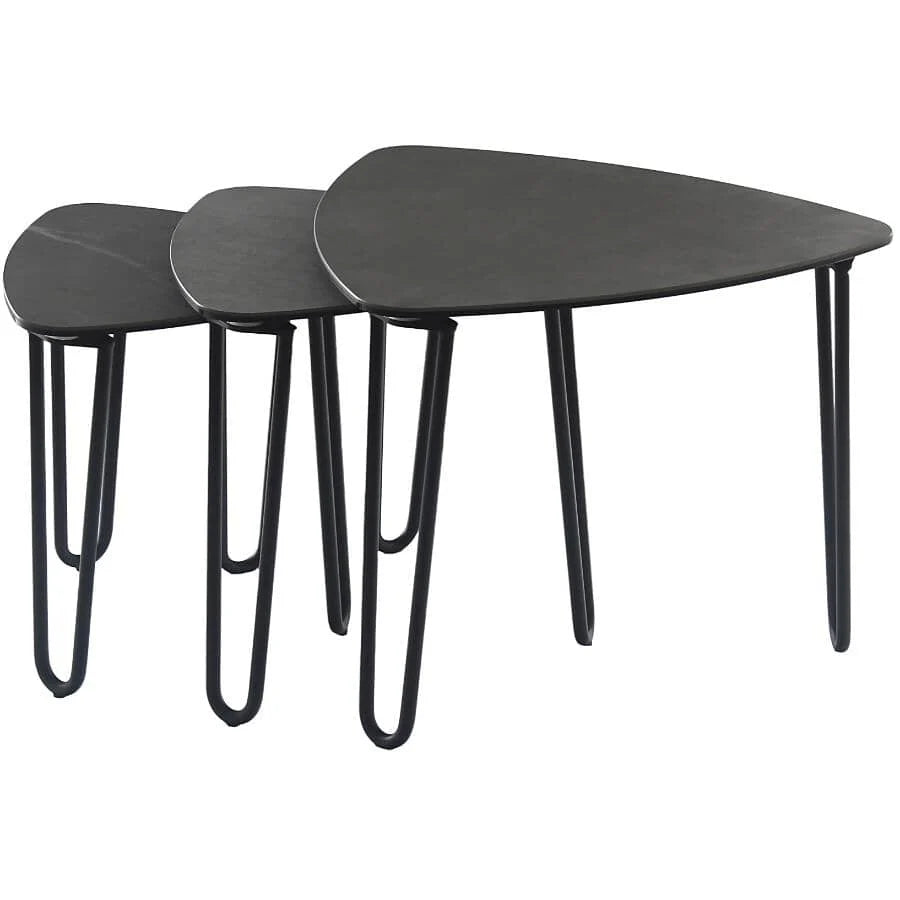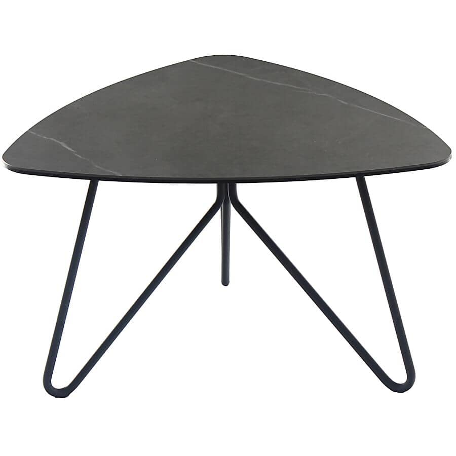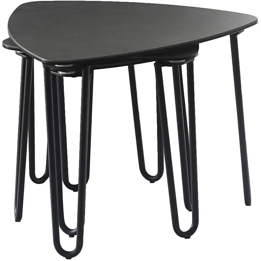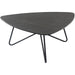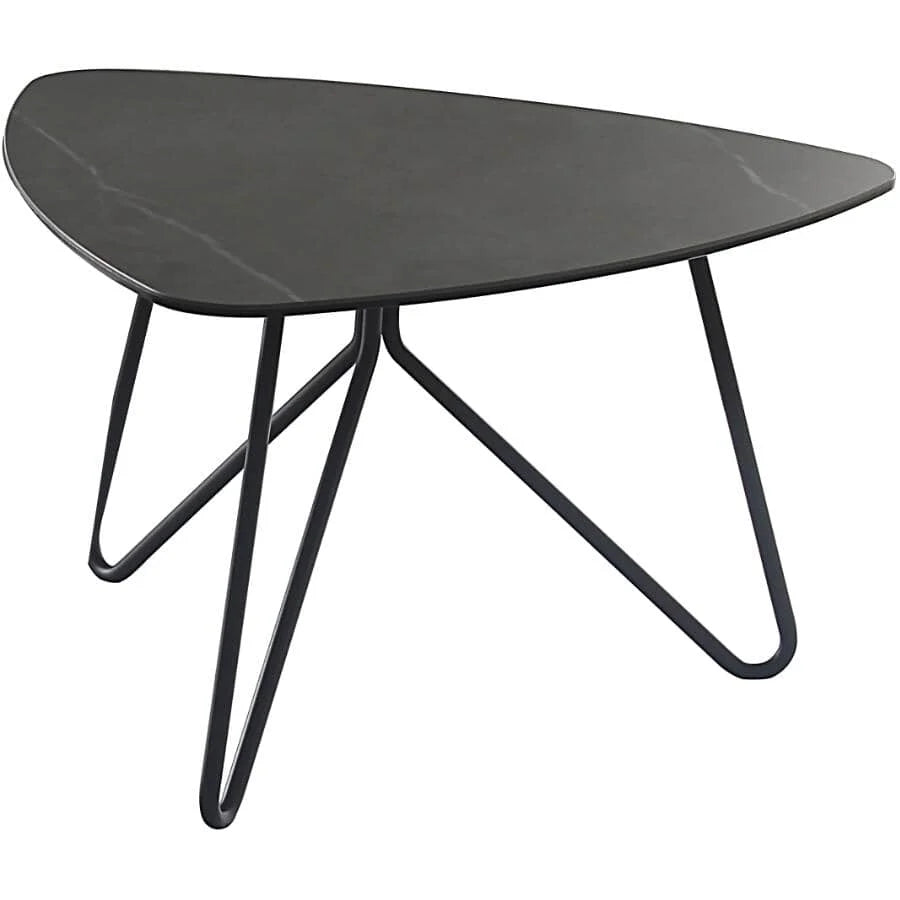 Elevate your living room with the refined elegance of the Gaia Coffee Table. Designed to make your space look professionally styled, this striking piece features a sculptural elliptical triangular tabletop paired with sleek black metal hairpin legs for a bold, modern statement.