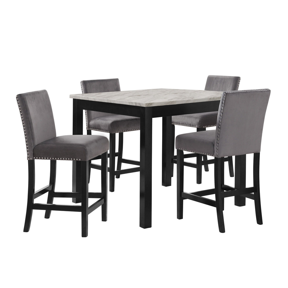 The Celeste Counter Height Dining set is a perfect blend of contemporary glamour and timeless functionality. This set includes a 42-inch square counter height dining table with a base and a faux marble top. Four plush velvet chairs are crafted with solid rubberwood legs and base stretchers that double as convenient footrests. The glossy finish on the table's top provides heat and water resistance for easy maintenance and protection against wear. Luxurious seating is assured with 100% polyester velvet fabric covering sumptuous memory foam cushions in the chairs. Tailored for elegance, the velvet is accentuated by silver nailhead trim, adding a sparkling final touch.