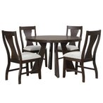 The Chestnut Ridge 5-Piece Dining Set brings together durability and style, featuring a round dining table and four side chairs that create an inviting space for everyday meals or cozy gatherings. Crafted from solid Rubberwood, manufactured woods, and wood veneers, the table offers a strong, stable foundation with sleek transitional styling. Its wide bottom angled legs and rich dark brown finish provide a versatile touch of sophistication that complements any décor. The 47.25" round table offers intimate seating for four, perfect for dining, conversations, or game nights. The side chairs, upholstered in soft beige 100% polyester fabric with full foam cushioning, ensure ultimate comfort, making this set both functional and stylish for any home.