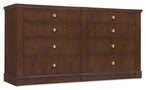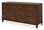 The Archives Dresser offers timeless elegance with a modern touch, perfect for bedroom storage. Crafted with figured quartered walnut veneers and oak veneer accents, this piece showcases a rich finish. It features spacious drawers, with cedar-lined bottom drawers and a jewelry tray. Satin brass custom knob hardware adds a luxurious touch to this refined design, making it an ideal choice for both traditional and modern interiors.