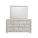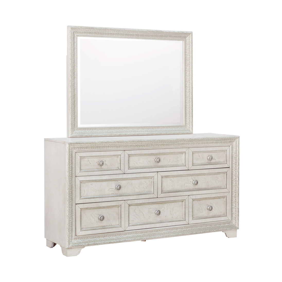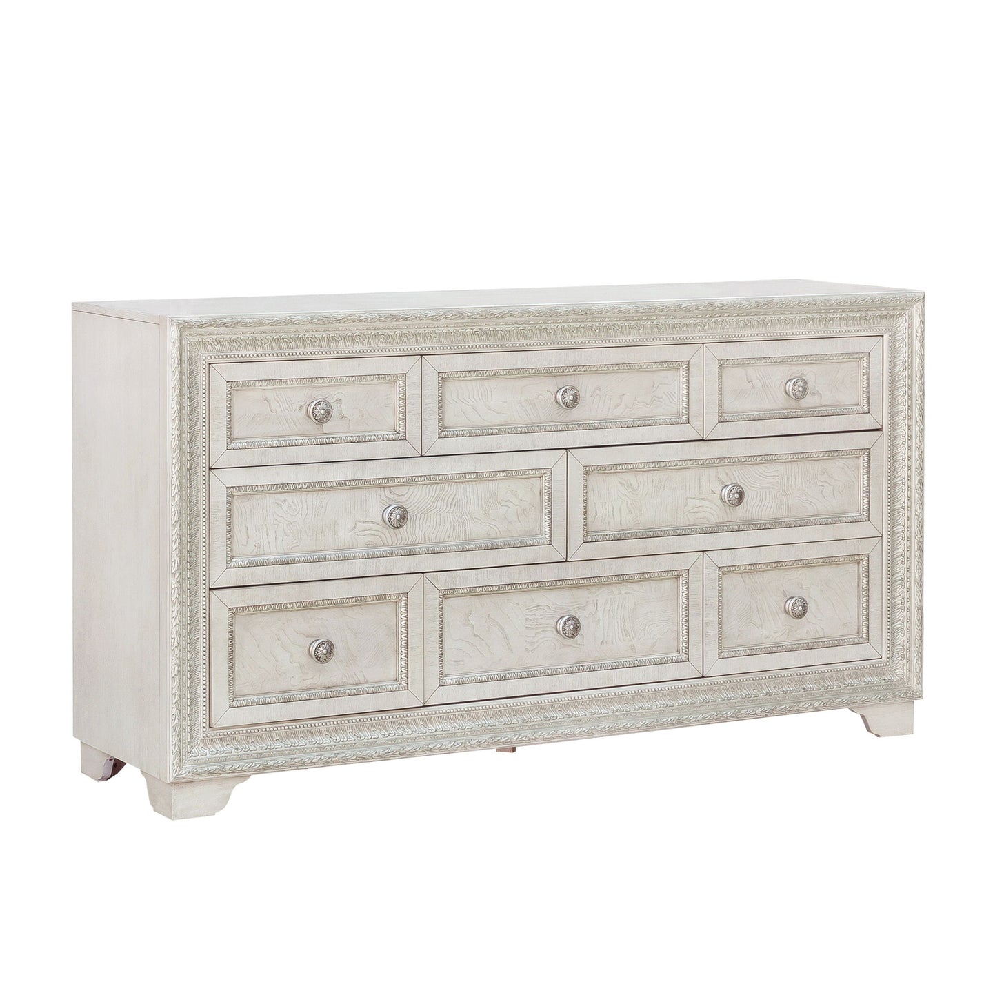 Bring elegance and functionality to your bedroom with our Camila 8-Drawer Dresser. This piece displays a quiet, regal presence, featuring eight drawers and silver-tipped intricate moldings for a shimmering, luxurious touch. A semi-transparent creamy white finish enhances the distinctive swirly ash veneer construction. Rosette-shaped silver drawer pulls and bracket feet complete the look, adding elegance to the overall aesthetic.