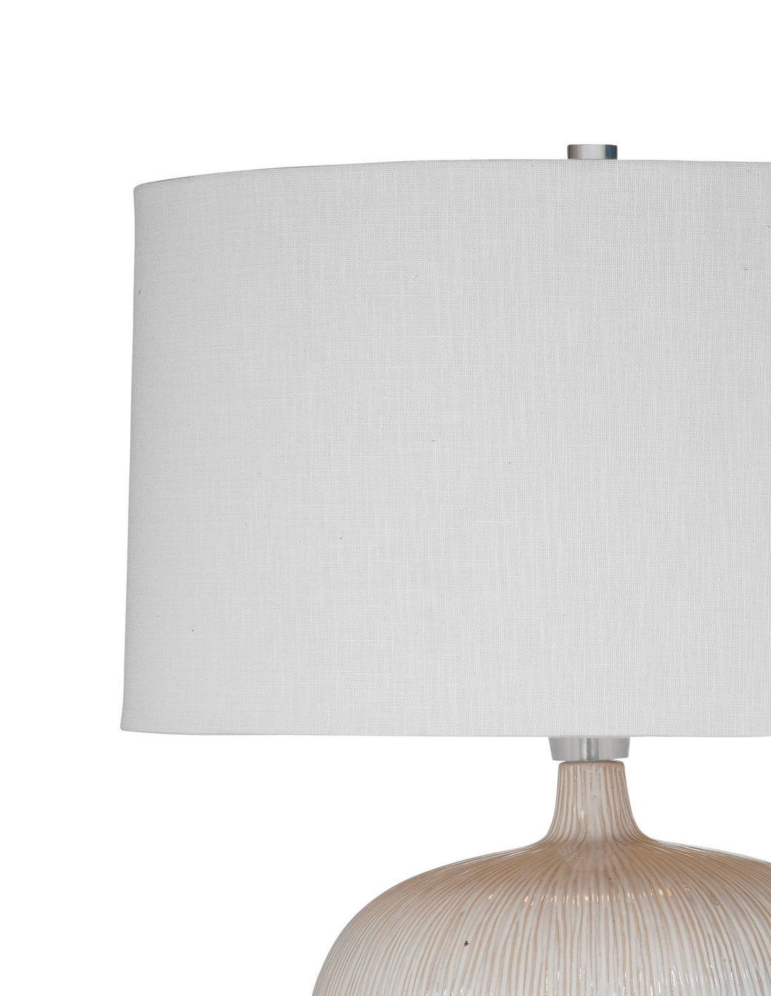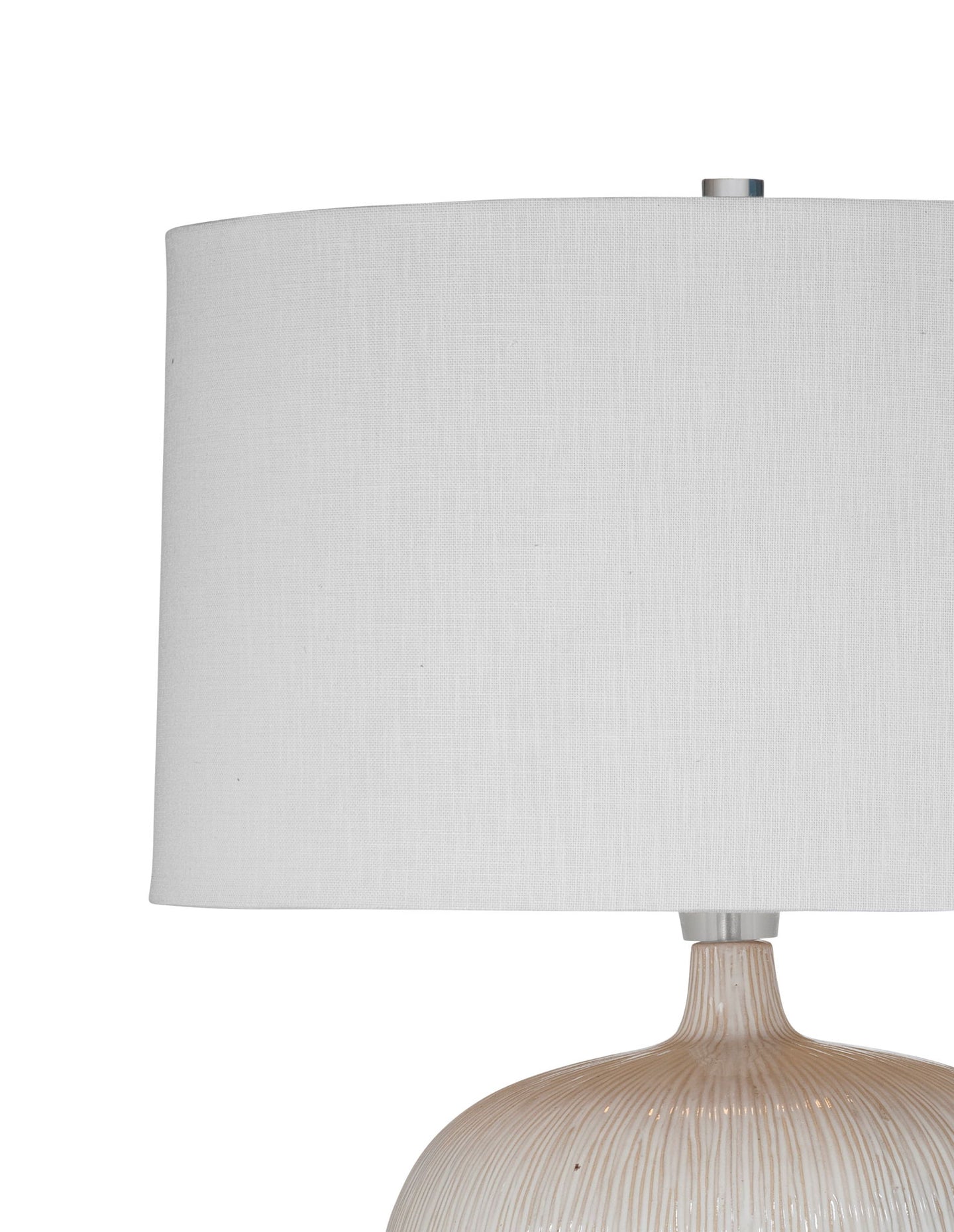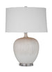 - The Arcadia Lamp features a round, white ceramic body with vertical tan grooves flowing from the neck