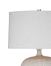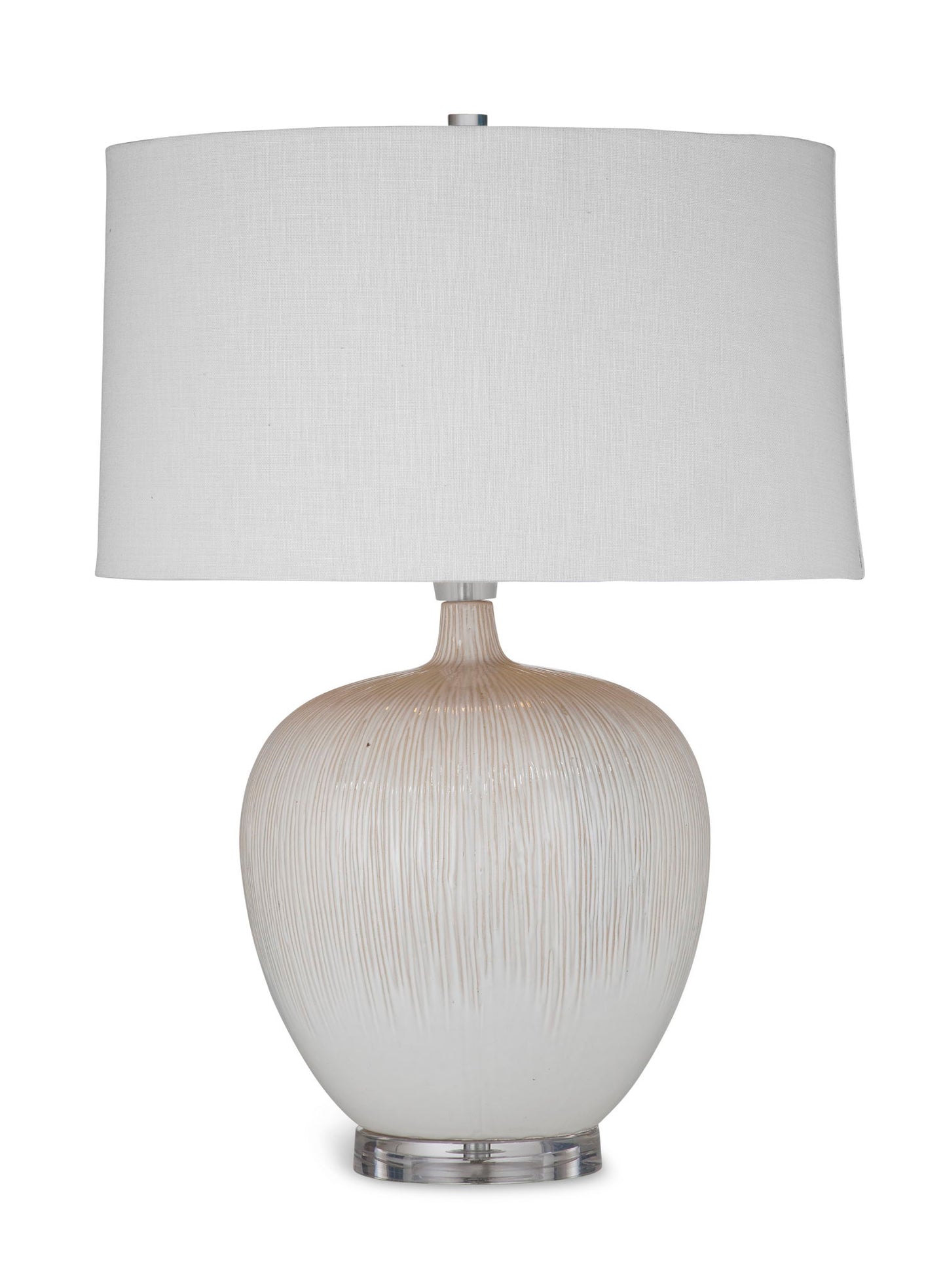 The Arcadia Table Lamp features a rounded ceramic base in a white finish with subtle beige tonal detailing and vertical surface texture. It is paired with a white linen tapered drum shade. The lamp is set on a clear acrylic base.