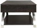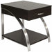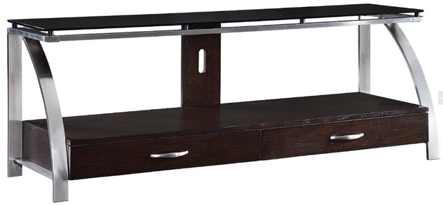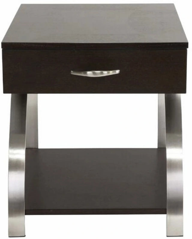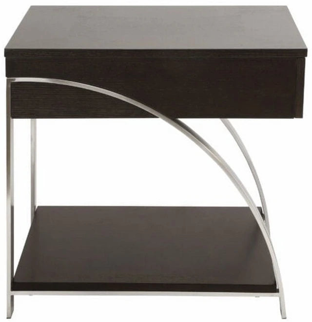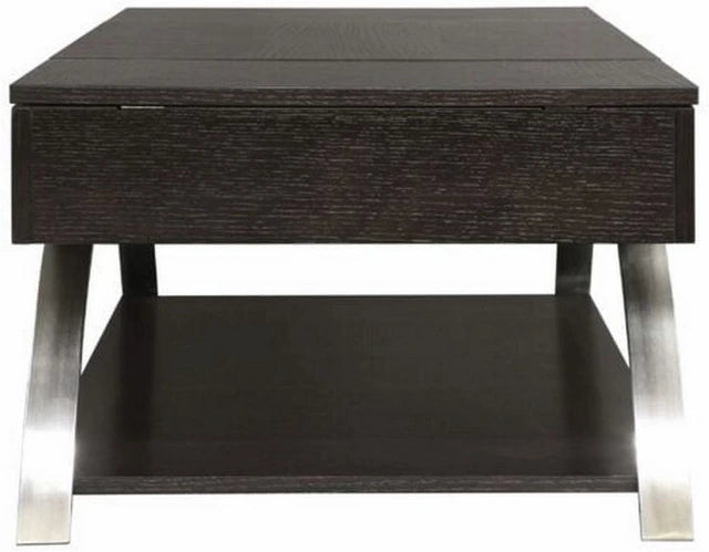 Description du produit : Conçue pour les intérieurs modernes, la collection Tioga apportera une touche d'originalité à votre salon. Les pieds géométriques en chrome brossé contrastent élégamment avec la finition espresso du plateau et de l'étagère de la table basse. La fonctionnalité de cette dernière est optimisée par un mécanisme de levage permettant d'allonger son plateau. Une table d'appoint, un bureau et un meuble TV assortis sont également disponibles.