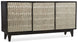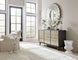 Stunning and luxurious, the Shimmer Three-Door Credenza is crafted of Mango Solids in a charcoal-finished exterior, contrasting with German Silver Foil over textured door fronts. Behind each of the 3 doors is one adjustable shelf and a ventilated back panel so the piece is media friendly.