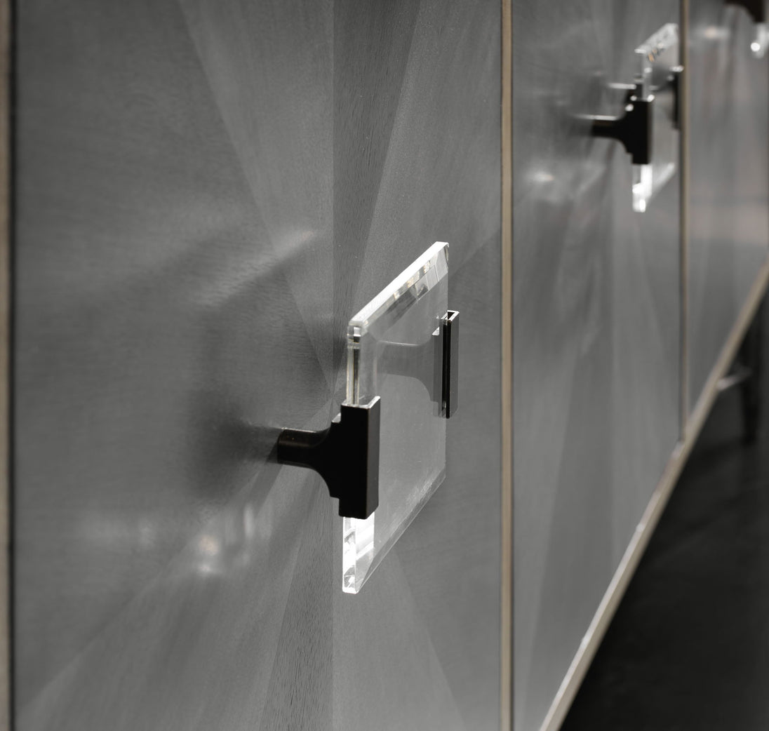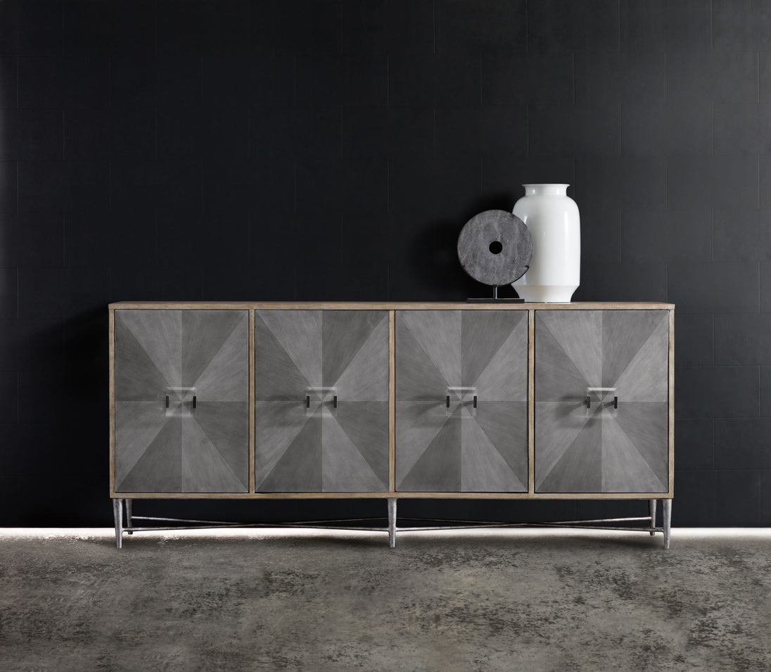 With its cosmopolitan flair and exquisite style, the Zola would be at home in a shop on Rodeo Drive – or in your living space. Crafted of Elm, Maple and Black Walnut, the case is finished in a natural color, while the front features a diamond pattern in contrasting gray tones, accented by jewelry-like Lucite pulls. A refined metal base in a silver finish creates the finishing touch. Four doors with soft-closing hinges, with one adjustable shelf behind both the center set of doors and the left and right doors.