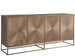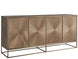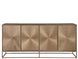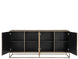 The Fusion Credenza glimmers in an Aged Brass finish, its surface catching the light with a radiant sheen. The doors, each embellished with a delicate, emanating pattern, add a layer of sophistication to the piece. With clean, precise lines framing its structure and two adjustable shelves nestled within, this credenza is a testament to elevated design, seamlessly blending functionality with a luxurious aesthetic