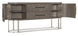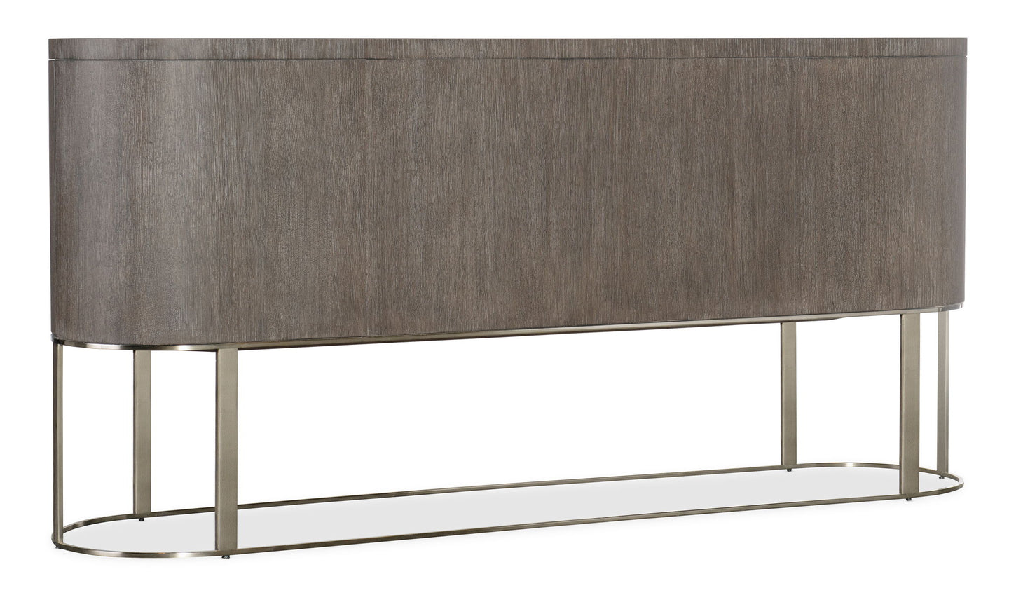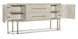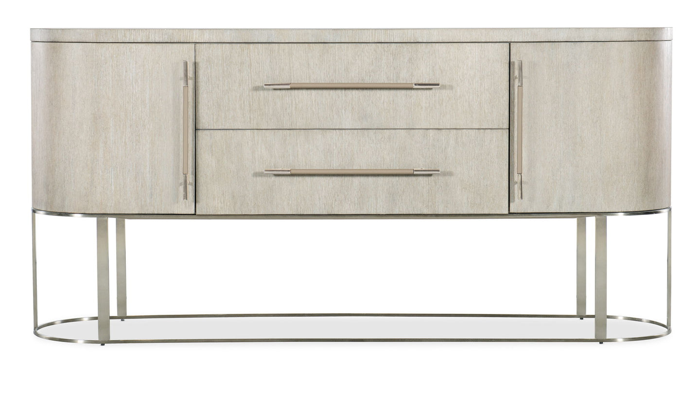Softly sophisticated with a clean modern profile and luxe mixture of materials, the Modern Mood Server is a stunning statement piece. The case has rounded corners, is finished on all sides and has an oval metal stretcher that goes all the way around. Crafted of Quartered Oak Veneers, the server has tactile wire-brush detailing in a serene Diamond finish. The metal on the hardware and base is in a brushed warm pewter finish, and the bar pulls are wrapped in leather. The two wood doors have soft-close hinges and magnetic catches. There’s one adjustable wood shelf behind each door, and the two drawers are self-closing and feature a drop-in silver tray liner in the top drawer.