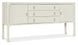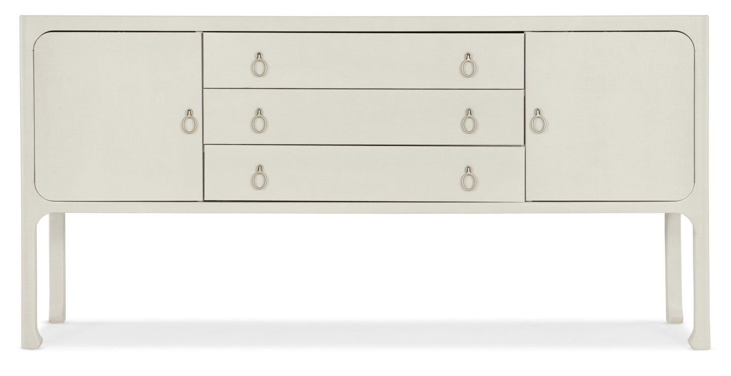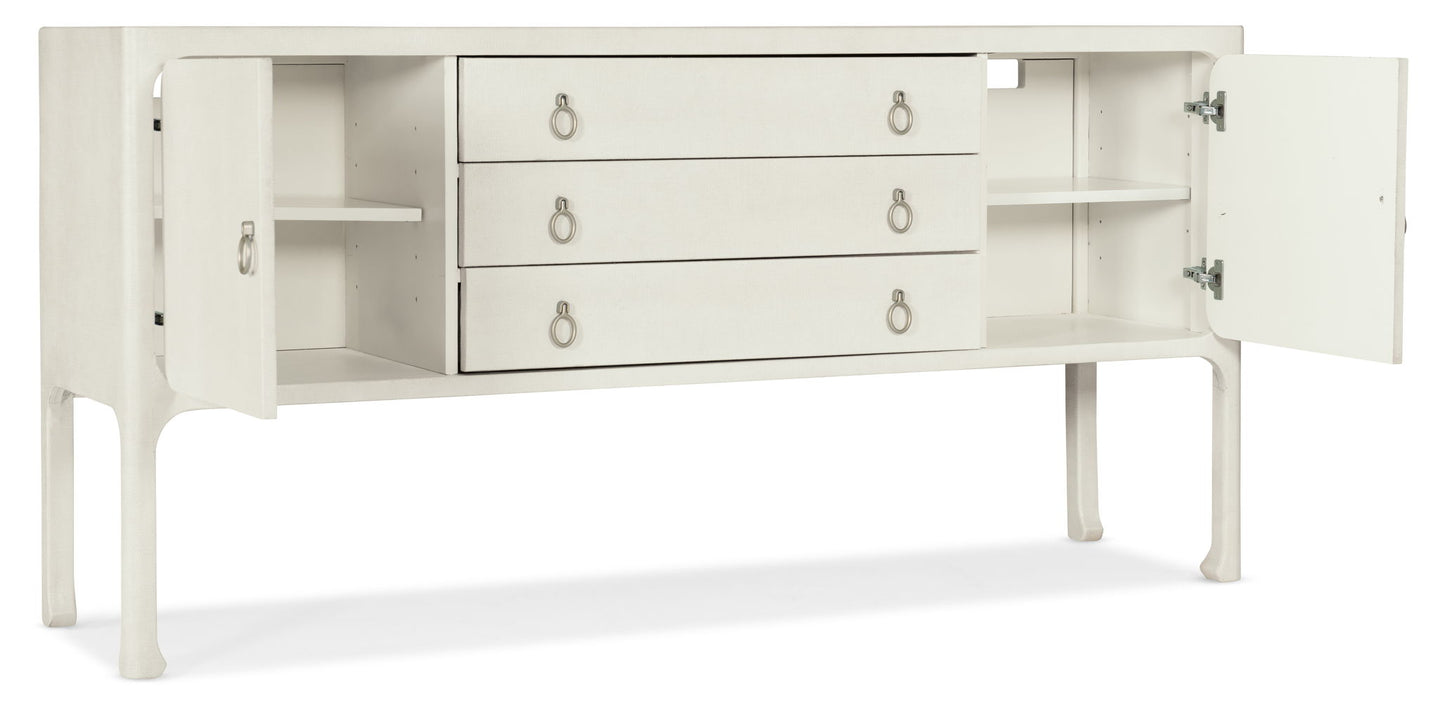 Create a comfortable and inviting retreat within your home with the Cove Shore Server, a piece that will help you extend hospitality with ease and grace. Crafted of wood and raffia, it is offered in the white lacquered grasscloth Sand Dollar finish with light champagne decorative pulls and chow legs giving a designer touch. There are 2 soft-close doors and one adjustable shelf behind each door. Three drawers with soft-close drawer guides. The top drawer has a removable black felt liner and removable black silverware tray.