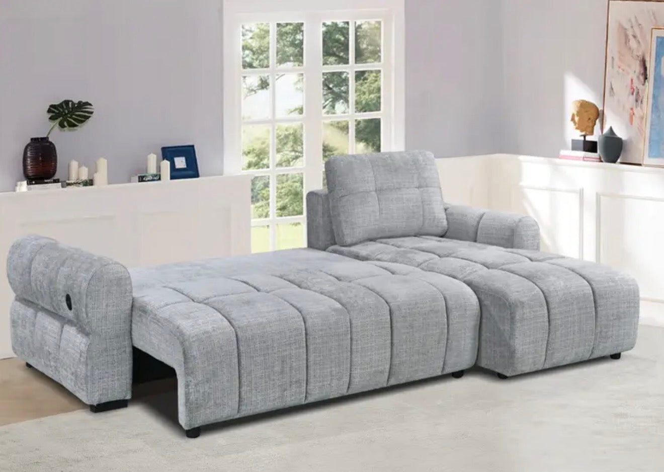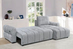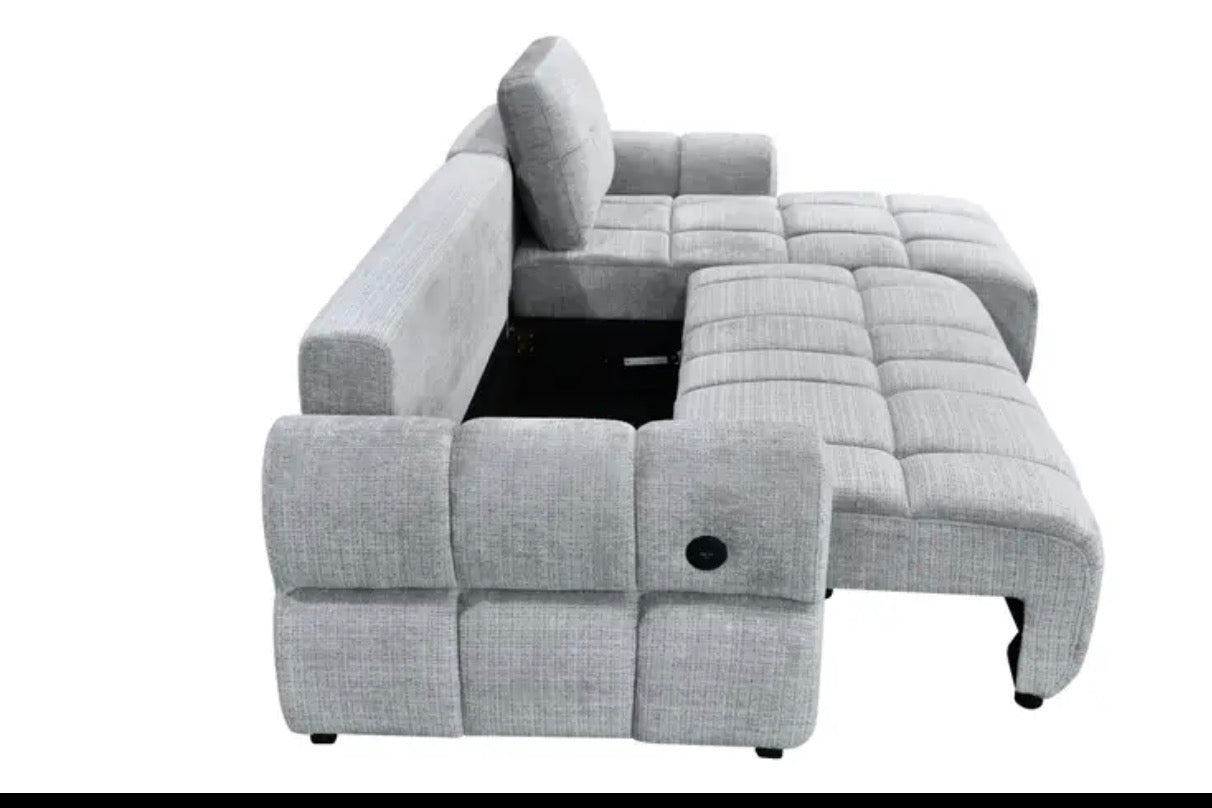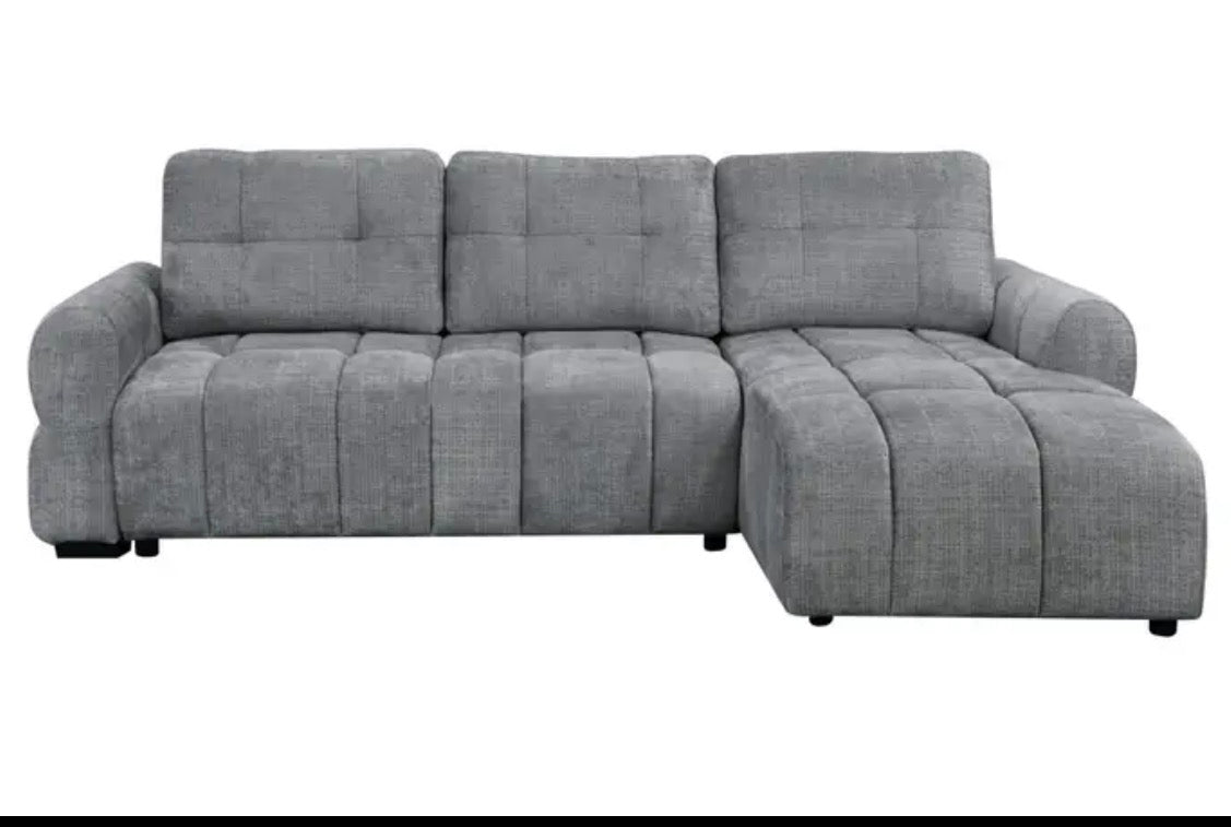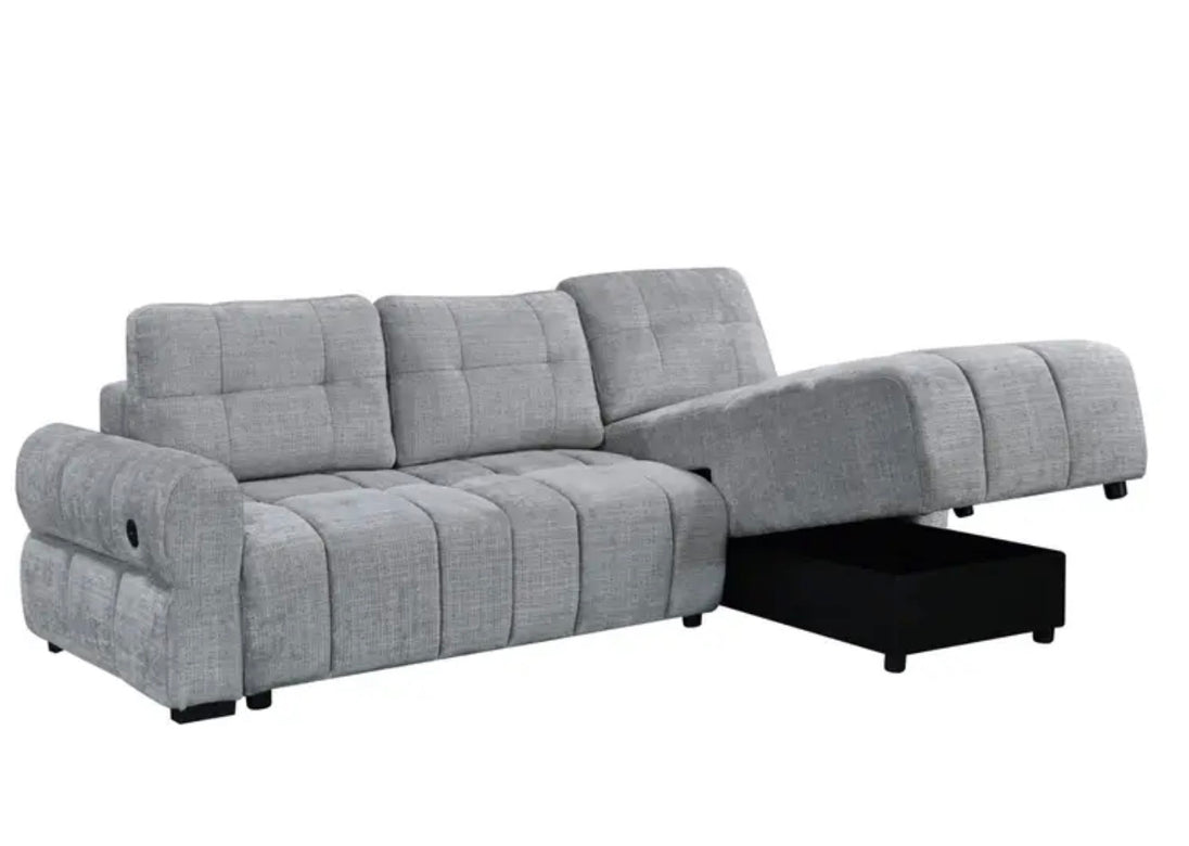 Upgrade your living space with the Hudson Convertible Storage Sleeper Sectional, a modern multifunctional centerpiece designed for comfort, convenience, and contemporary style. Upholstered in a soft textured grey fabric, this sectional features clean channel tufting, plush cushioning, and a spacious chaise lounge that invites you to relax in style.