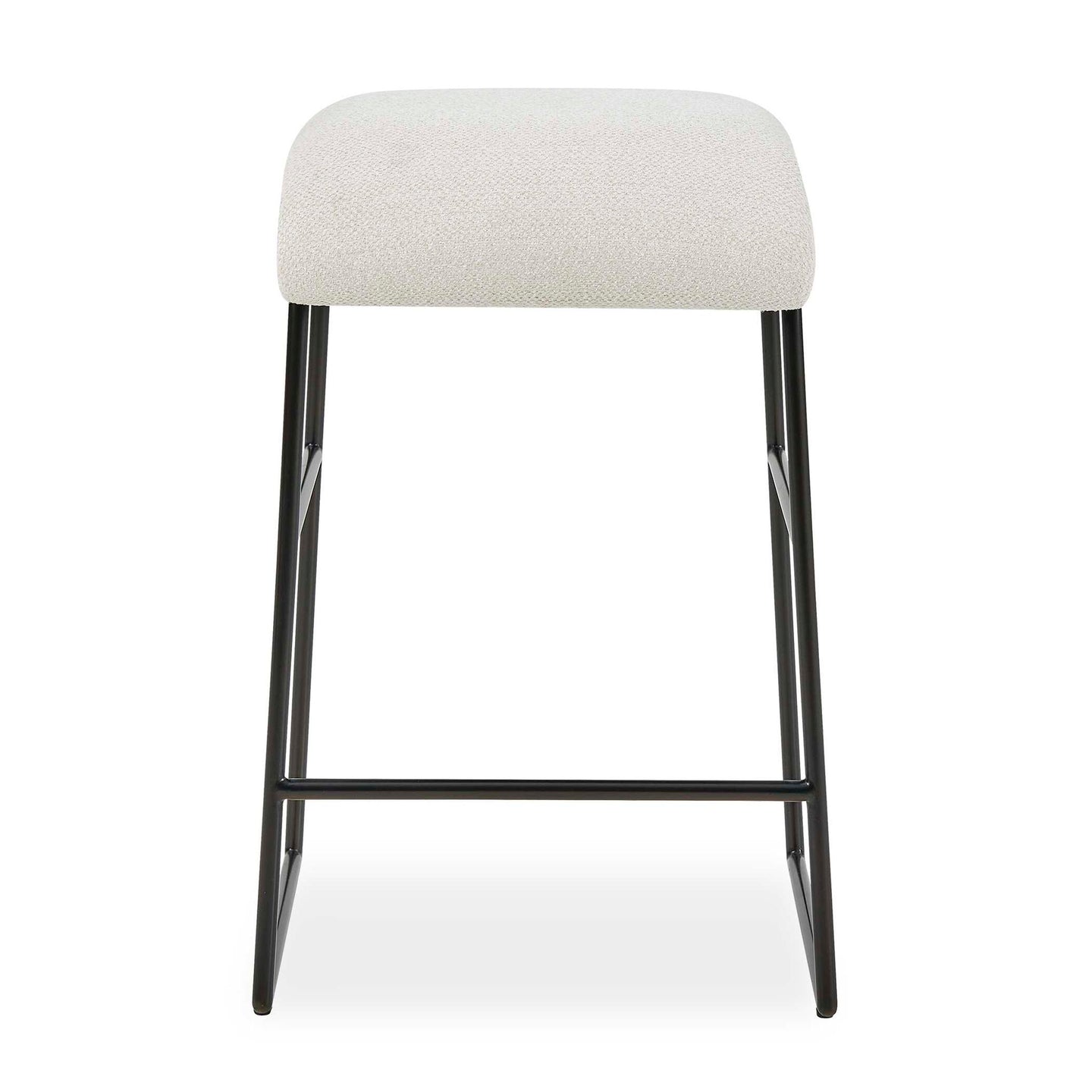 The Arcane Counter Stool Features A Gracefully Curved Cushion That Provides Both Comfort And Style, Upholstered In A Bleach Cleanable Solution Dyed Polyester In Lightly Textured Ecru, Resting Upon A Matte Black Metal Frame.