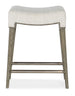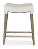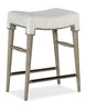 Nostalgic and chic with the aura of a rustic mountain cottage, the Green Valley Counter Stool has a wood frame in a rectangle shape finished in the smoked gray Mink color, and a fabric seat covered in the neutral performance texture Remington Porcelain. Nailhead trim gives a designer touch.