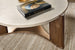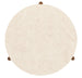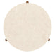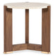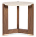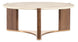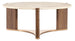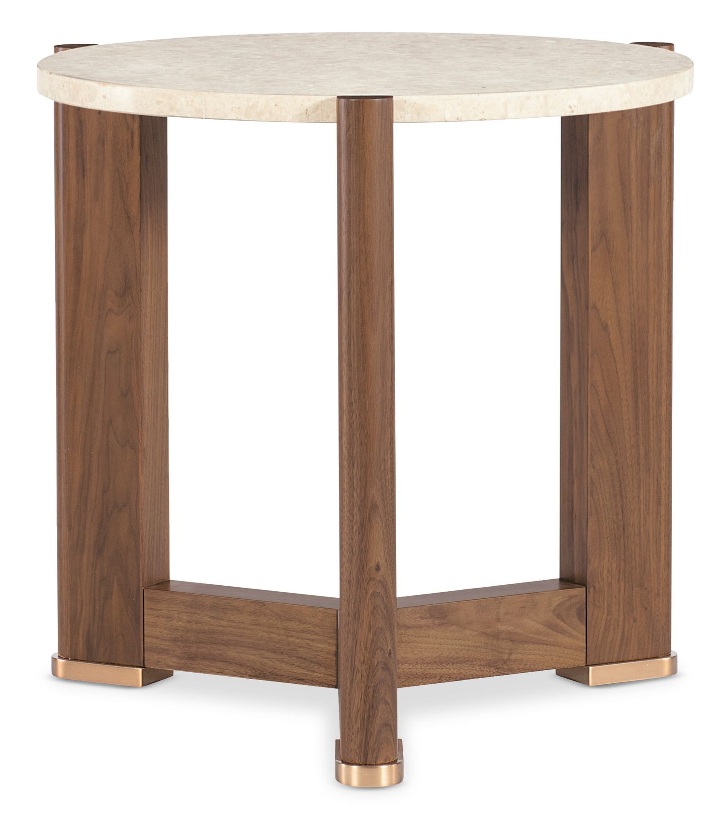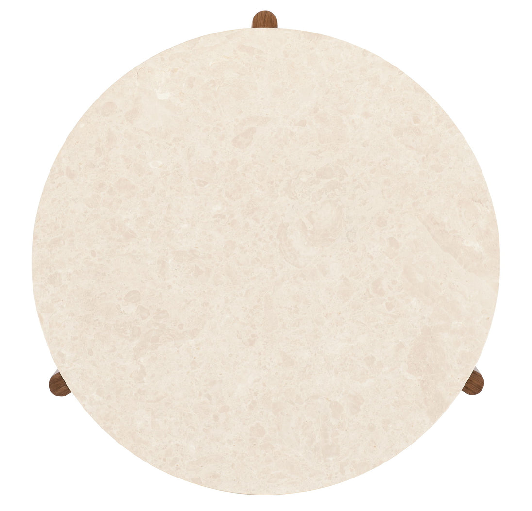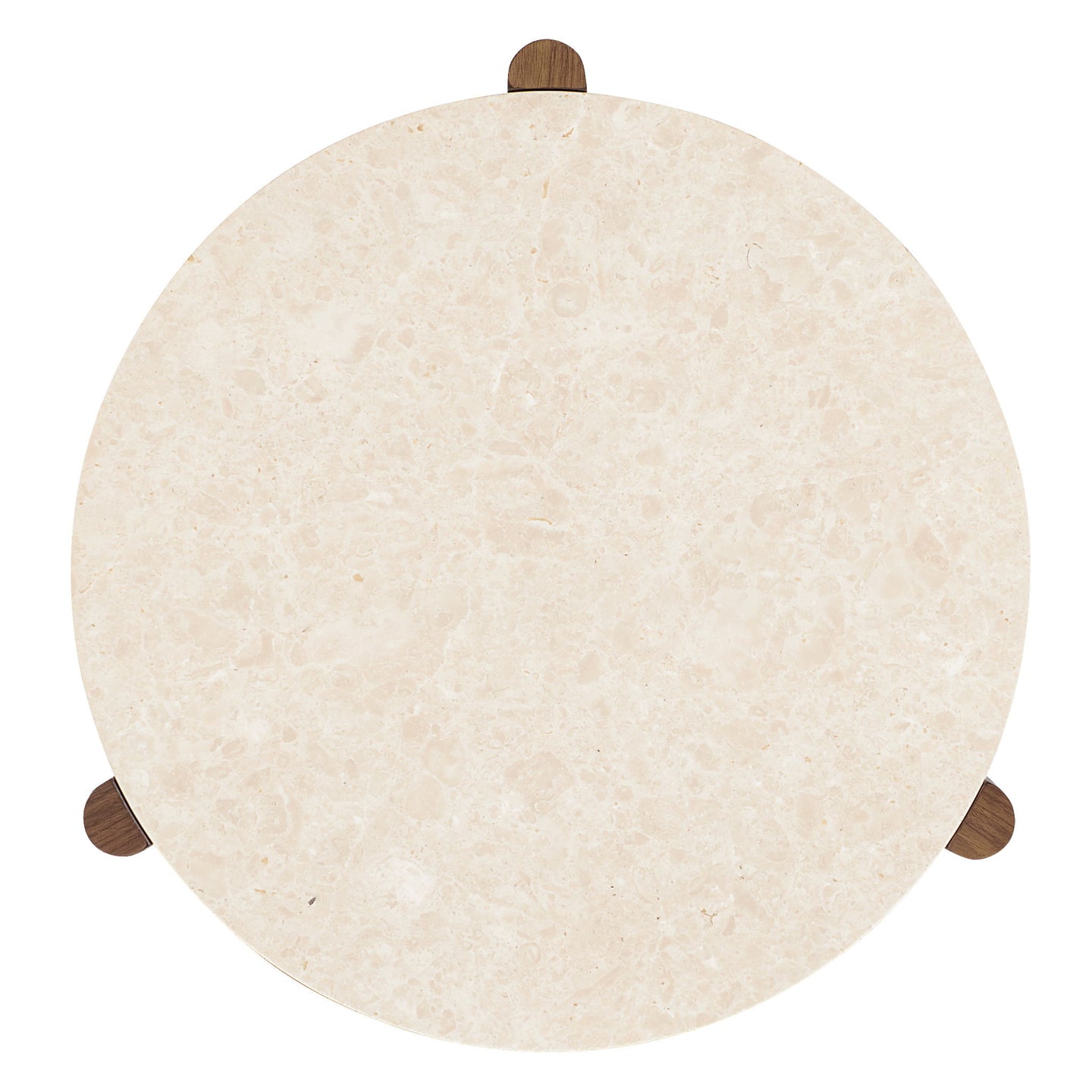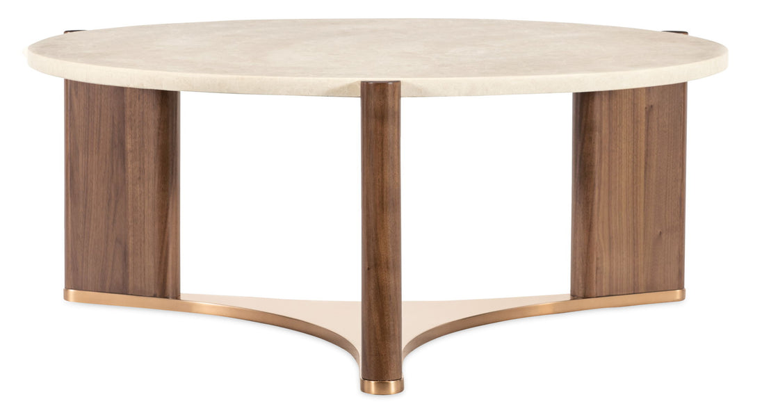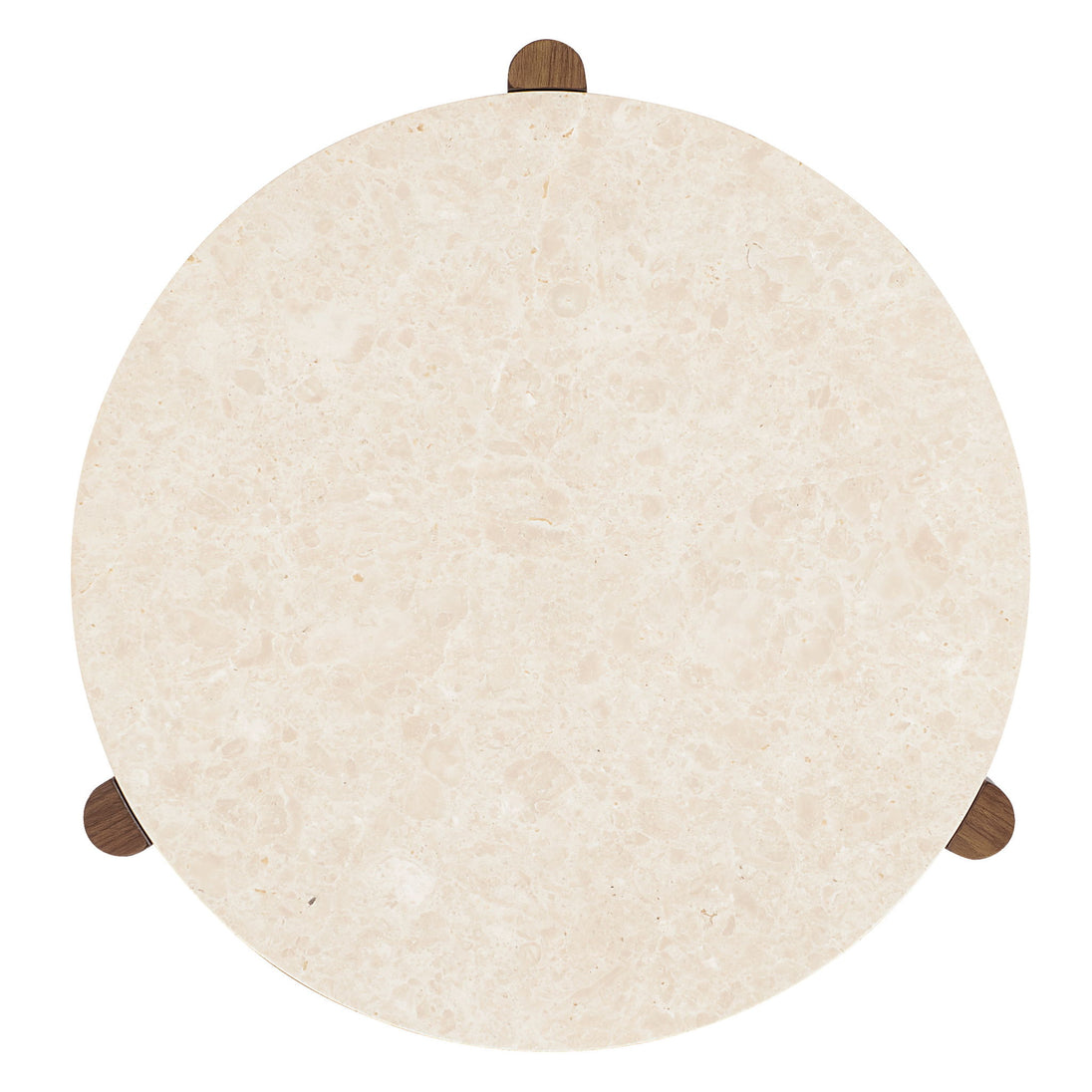 The Eleana Round Table is a refined centerpiece featuring a honed marble top with white and beige tones, perfectly complemented by a Light Caramel walnut veneer base and plated Sunlit Bronze metal accents. Its round shape and triangular pedestal design bring a sense of sculptural balance and sophistication, ideal for transitional living rooms that value both beauty and functionality.