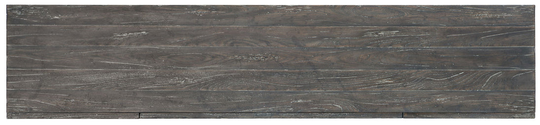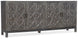 With a raised graphic pattern on its door fronts, mottled copper hardware and a soft grey Shale finish with natural wood undertones, the Beaumont Entertainment Console has a chic industrial vibe that fits in interiors from classic to modern to Bohemian. Accommodating an 80-inch TV, the entertainment center has one drawer and one adjustable shelf behind each pair of doors.