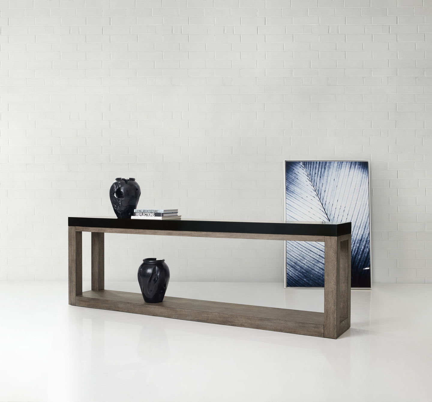 Simplicity of form adds grace and gravitas to the Vienna Console, crafted of Quarter Cut Oak Veneers with a brown finish on the base and a black top. Distressing including wire brushing and sandblasting gives the console a refined, rustic and relaxing appeal.