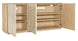 Tranquil and modern with a tropical retreat-inspired vibe, the Retreat Entertainment Center has a striking carved wave motif on the door fronts. Crafted of Oak Veneers and Resin, the case is finished in the sand-colored Dune finish, while the door fronts have a lighter contrasting finish. The entertainment center features three doors with soft-close hinges and touch-latches, two adjustable shelves behind the left door, two adjustable shelves behind the pair of right-side doors, a ventilated back panel and a three-plug electrical outlet located behind the pair of right doors.