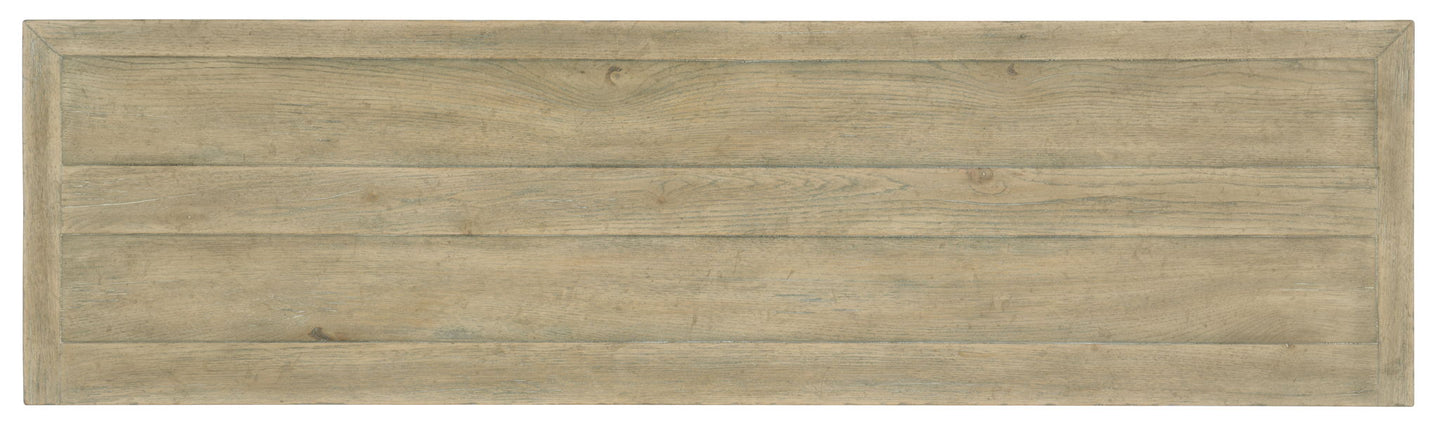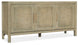 With a laid-back tropical vibe, the Surfrider Media Console has three rattan-front doors with soft-close hinges and is finished in Driftwood, a light natural finish with distressing. Crafted of Pecan Veneers and Rattan with a Solid Wood edge top, the console has one vented adjustable shelf behind the left pair of doors and one vented adjustable shelf behind the right door, a ventilated back panel and one 3-plug electrical outlet. Accommodates a 65-inch flat screen TV.