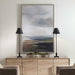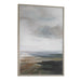 Lowlands Framed Canvas Displays An Abstract Landscape In A Palette Of Grays, Blues, And Warm Browns. A Double Gallery Frame, In White And Gray Washed Wood, Encases The Artwork. Each Canvas Is Proudly Handcrafted And Printed In The USA. Artwork By Liz Jardine.
