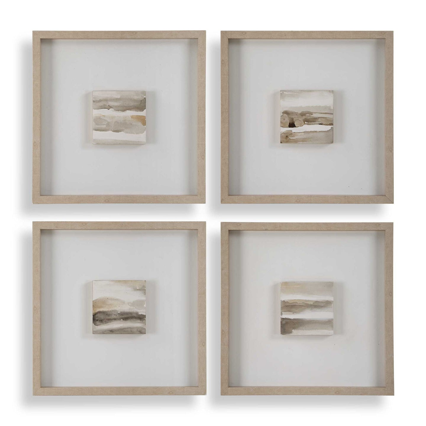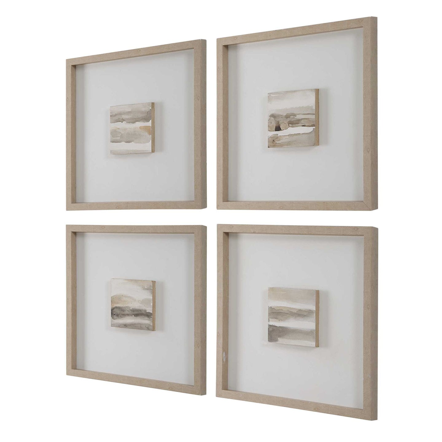 This Striking Set Of Four Features Abstract Landscapes In A Soothing Palette Of Earthy Beige, Gray, And Brown. Each Piece Is Painted On A Petite Wooden Board And Mounted On A Clean White Canvas, Enased In A Naturally Finished Wooden Frame, A Design Choice That Beautifully Enhances The Art With Depth And A Modern Aesthetic. Due To The Handcrafted Nature Of This Artwork, Each Piece May Have Subtle Differences. May Be Hung Horizontal Or Vertical.