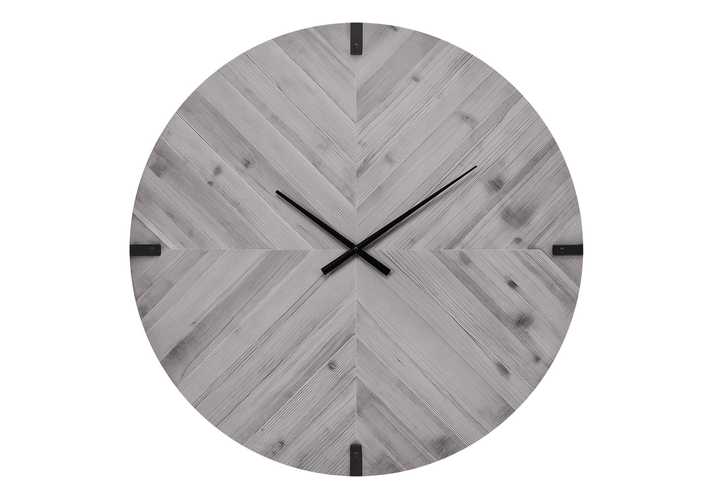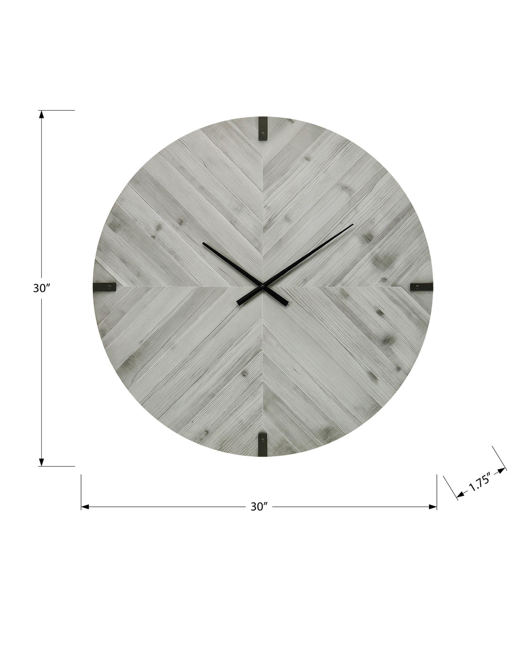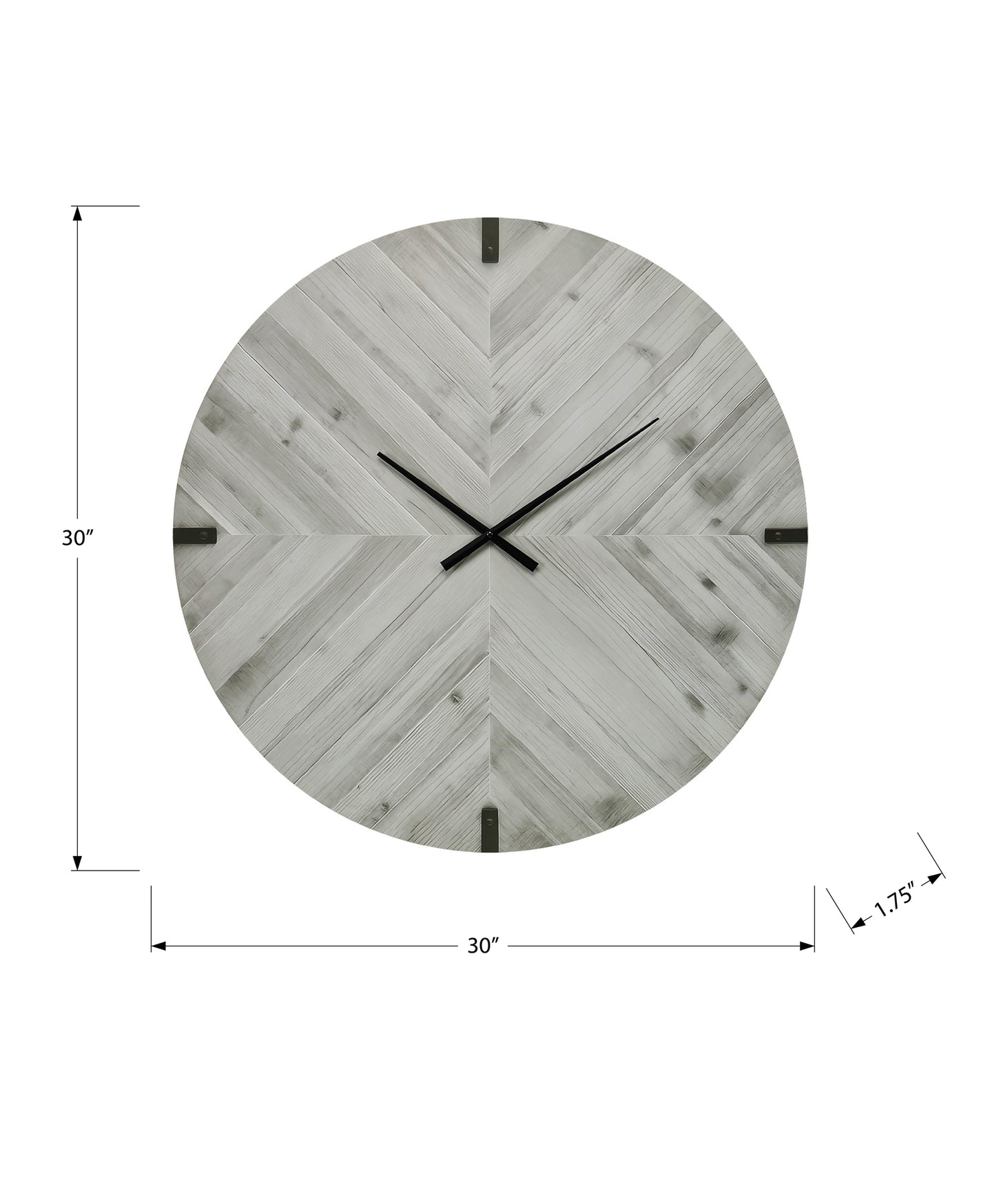 - This 30" round wall clock in a chic wood-look grey finish adds a striking modern touch to any room, making it the perfect statement piece for stylish home or office decors.