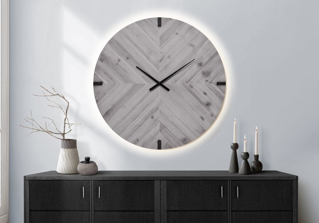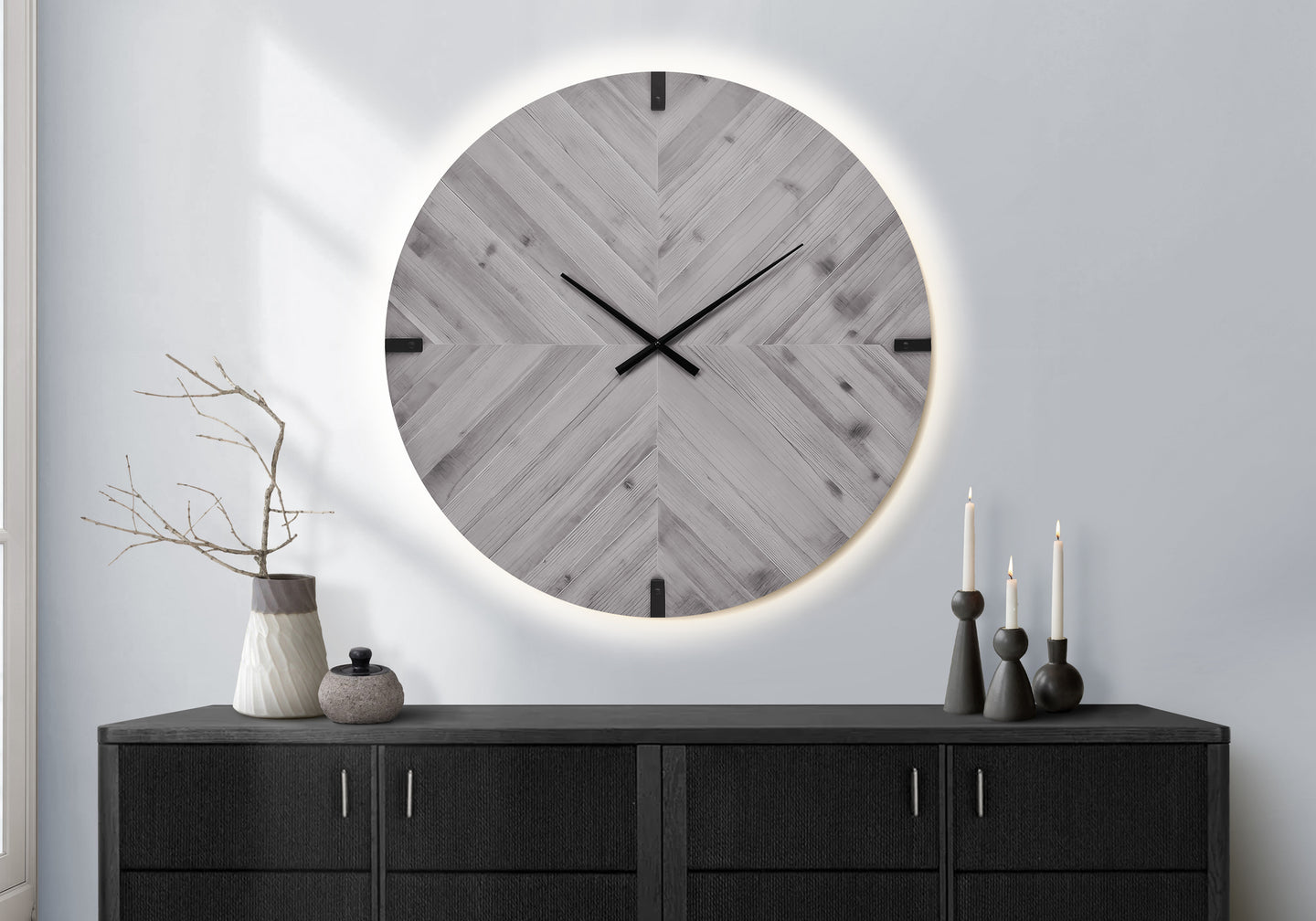 Illuminate your wall space with this bold, 30" round grey wall clock with integrated LED lights that will transform your home decor. Designed for the trendiest customers who appreciate both style and functionality this contemporary, large, oversized decorative clock with a wood-look printed face not only serves as a striking visual element but also ensures accurate timekeeping with quartz movement. It features a non-ticking mechanism so you can enjoy a peaceful ambiance in your home and an easy to read minimalist display for time-checking at a quick glance. The built-in ring of LED lights behind the clock adds a warm glow to create an inviting atmosphere any time of the day with the use of the wireless remote control (battery included) and plug-in wall adapter, allowing you to customize the LED settings with ease to fit your mood and style. For indoor use only, this exquisite analog clock is a breeze to setup with no assembly required, simply pop-in 1xAA battery (not included) to start the operation. Backed by a 2 year limited warranty against manufacturer defects for a confident purchase, this is more than just a timepiece; it is an investment in home decor that reflects your unique sense of style.