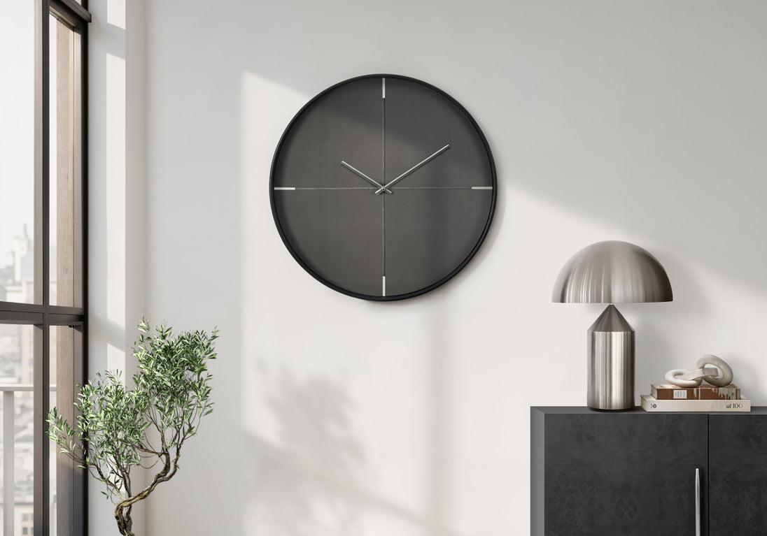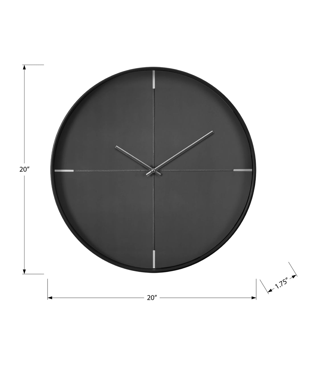 - This 20" round wall clock in a sophisticated black finish features a modern aesthetic that complements any contemporary home decor, making it a stylish statement piece for trendy interiors.