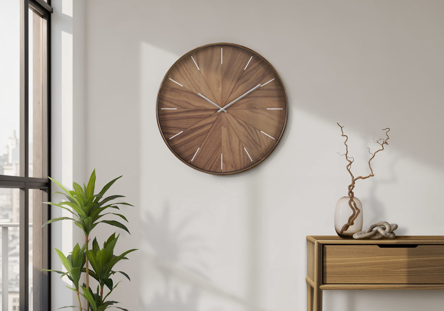 Bring some contemporary charm to your home décor with this stunning 20" round wall clock, the perfect blend of chic design and accurate timekeeping. Encased in a sleek brown plastic frame with a wood-look light brown face, this decorative piece is not just a timekeeper; it's a statement of modern aesthetics! The easy to read contrasting silver time markings and clock hands under the glass surface reflects sophistication and style, making it a standout piece in any room. The non-ticking quartz movement ensures a peaceful environment while keeping track of your day. No assembly is required, just insert 1xAA battery (not included) and this analog clock is ready to hang for immediate enjoyment. For your confidence, a 2-year limited warranty against manufacturer defects is included, ensuring a quality made investment. Whether refreshing your living room or adding a touch of elegance to your office, this indoor use only clock is an easy addition to your home decor.