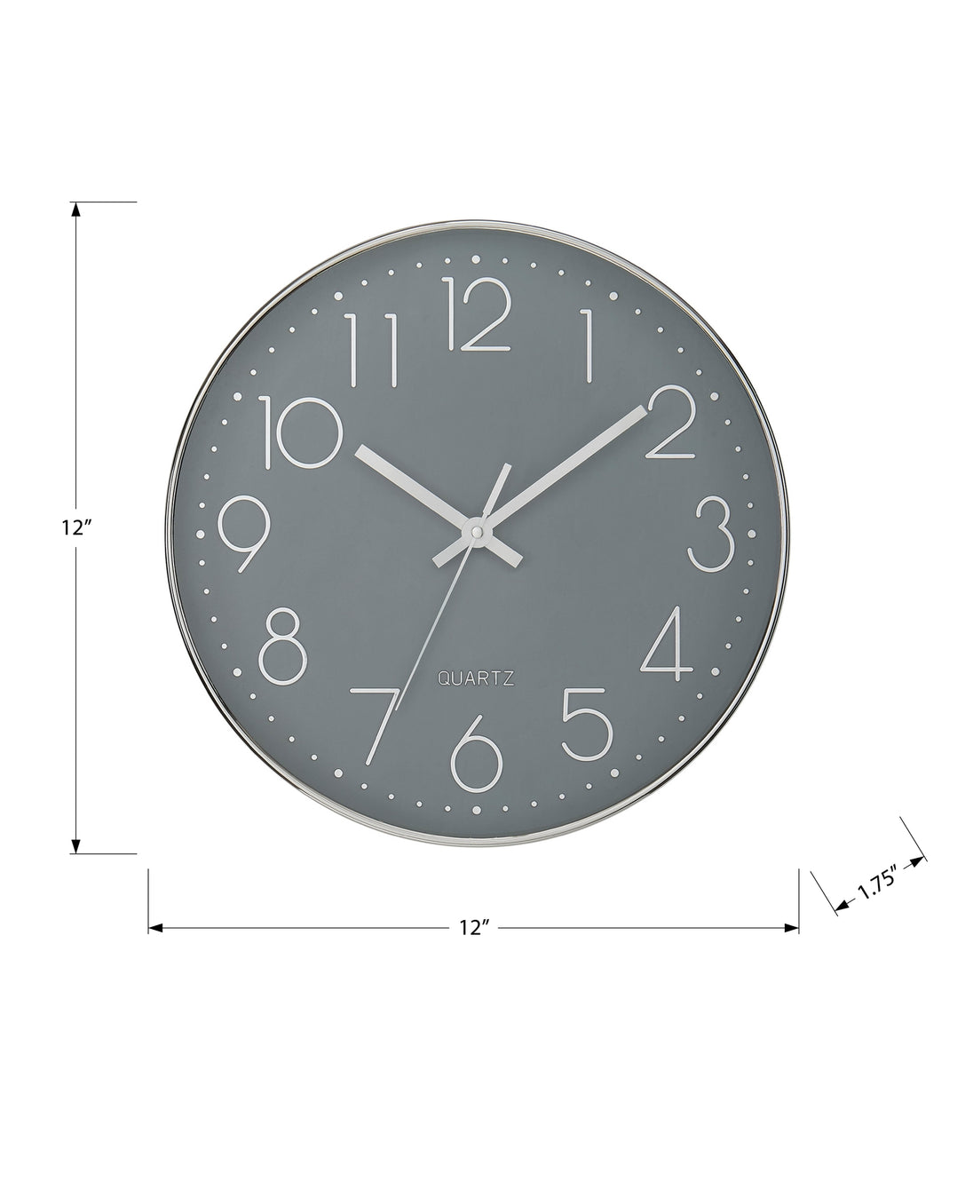• Add an industrial contemporary touch to your decor with this sleek 12" round wall clock featuring a chic grey face set against a stylish silver frame.