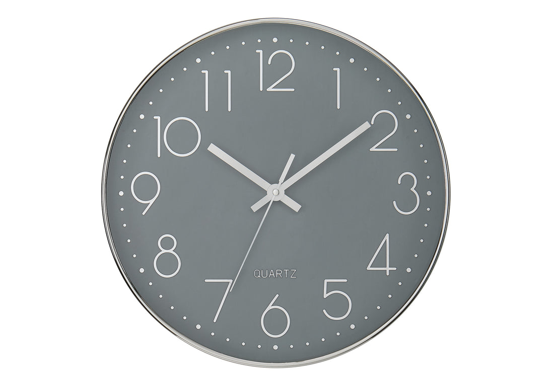 Add some industrial modern style to your home decor with this sleek 12" round wall clock featuring a chic grey face wrapped in a silver frame. This contemporary clock is designed for modern living spaces, making it a must-have for those seeking both style and functionality. Crafted from high-quality materials, this decorative wall clock features a durable plastic frame and boasts a glass surface with an easy to read analog display. With its numeric design and precise quartz movement, you'll enjoy accurate timekeeping without the annoying ticking noise, perfect for a serene indoor environment. Installation is a breeze with no assembly required, so you can effortlessly hang this stylish timepiece on any wall in your home. Plus, with a generous 2 year limited warranty against manufacturer defects, you can rest assured you are investing in quality. For indoor use only.