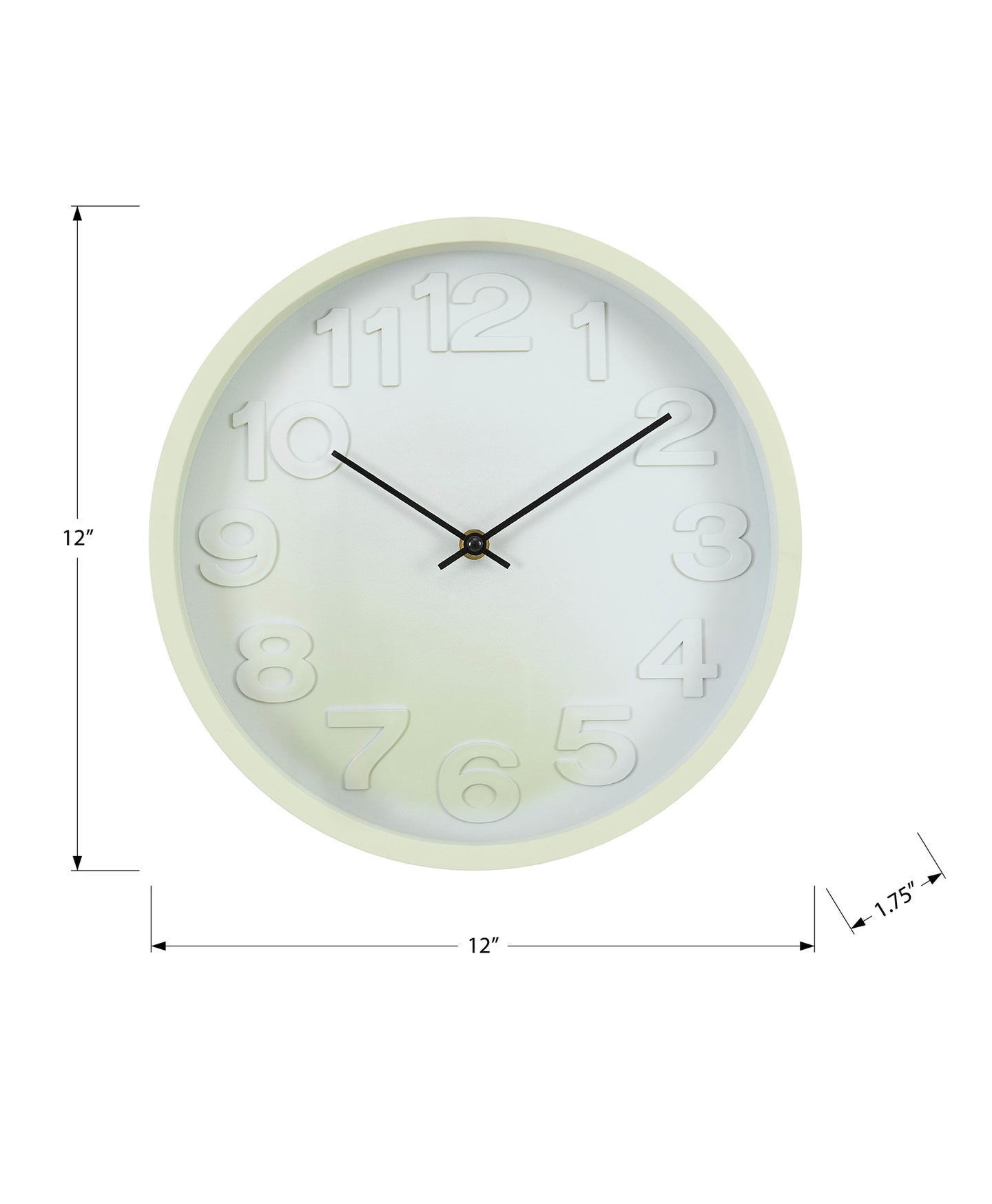 Freshen up your home decor with this stunning 12" round wall clock, featuring a chic light green face and a matching green plastic frame that embodies the essence of contemporary design. This exquisite timepiece seamlessly blends functionality with elegance, making it an ideal addition to any modern living space or juvenile room. Crafted with a glass surface for a sleek and polished look, our wall clock is not just decorative, but also designed for accurate timekeeping with quartz movement technology. The easy-to-read numeric display ensures you'll never miss a moment, while the non-ticking mechanism creates a tranquil ambiance, perfect for bedrooms or study areas. This clock requires 1xAA battery for operation (battery not included) and features a hassle-free design that requires no assembly. Plus, enjoy peace of mind with our 2-year limited warranty against manufacturer defects, ensuring you can trust your purchase for years to come. Add a touch of style and sophistication to your space with this simple analog wall clock, a trendy statement piece that merges modern aesthetics with practical design. For indoor use only.