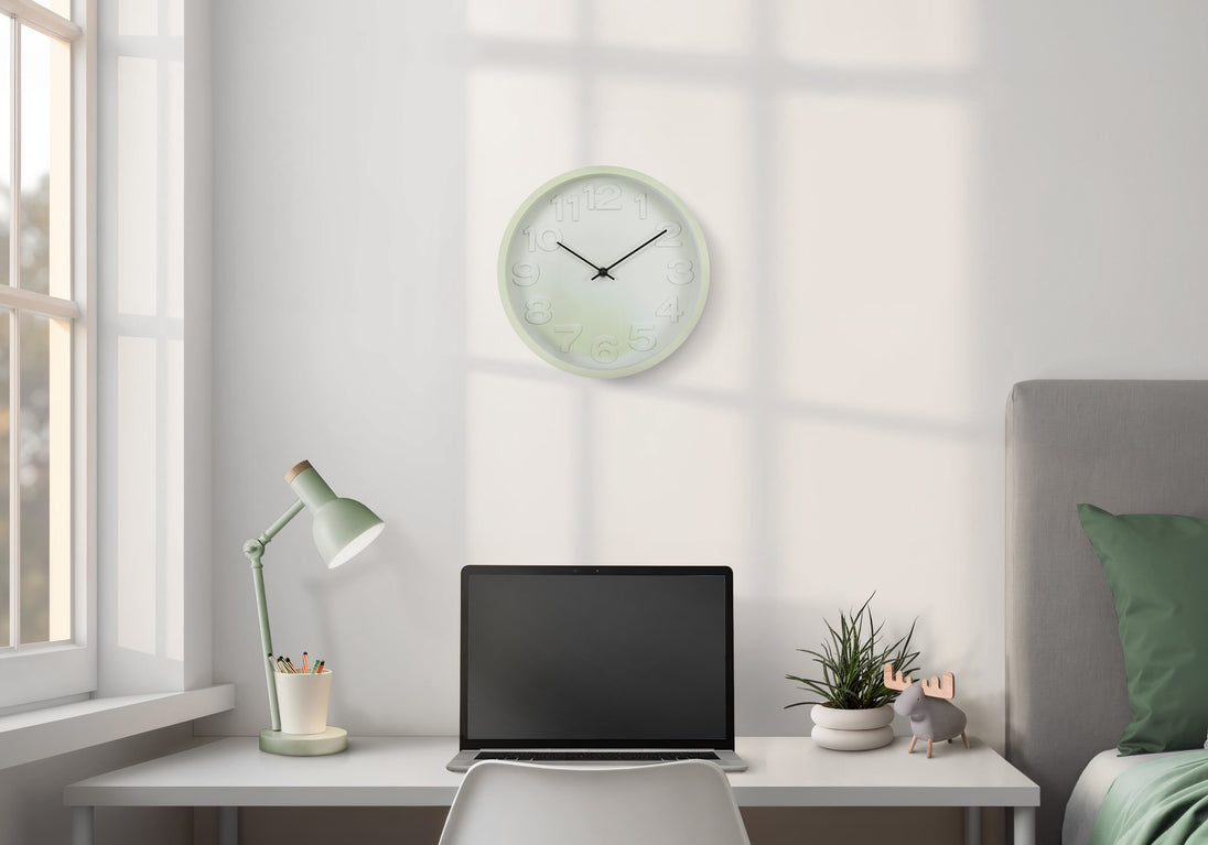 - Liven up your home decor with this trendy 12" round wall clock featuring a stylish light green face and matching plastic green frame that embodies modern aesthetics, perfect for both contemporary and juvenile spaces.