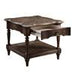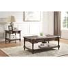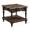 The elegant profile of the Heath Court Collection blends timeless design elements to create a refined focal point for your traditional living room. A sunburst-patterned tabletop crafted with white oak veneer highlights the natural wood grain beneath a rich brown oak finish. Classic details such as turned legs, decorative corner accents, and antiqued bronze-tone hardware lend sophistication, while functional drawers and an open lower shelf add everyday practicality.