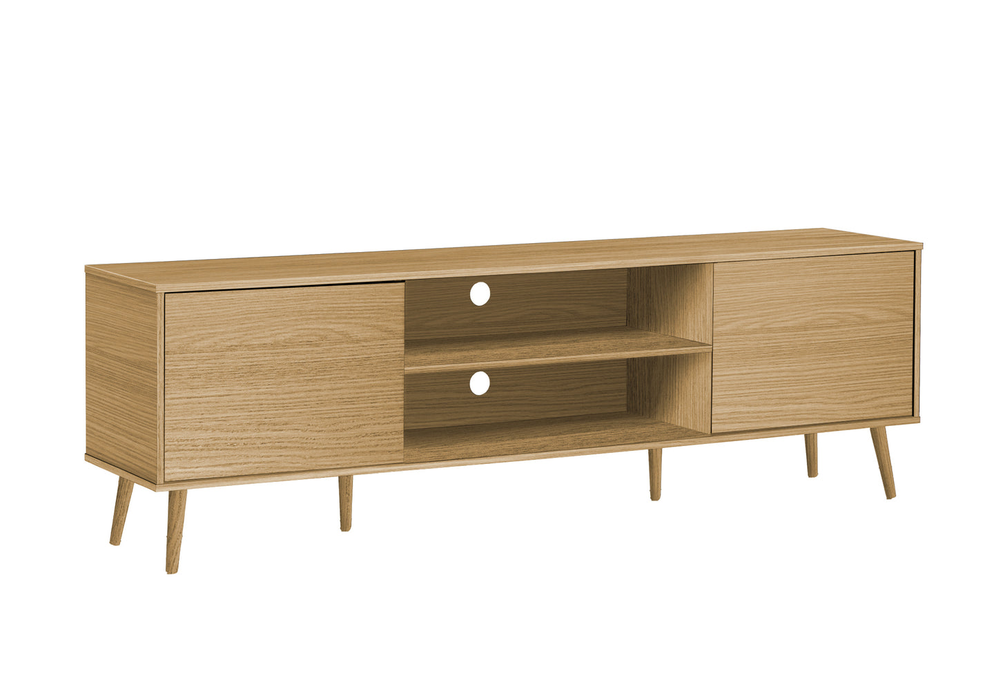 Make a modern statement and stay organized with this 72 inch tv stand. Featuring a wood-look natural laminate finish with solid wood legs give this tv console unit a unique and stylish contemporary flair. The two cable management holes behind the fixed shelf provide efficient storage and organization, and the two closed cabinets with a push latch mechanism for simple access to books, media, and gaming accessories. With an easy to clean top and a 5 year limited warranty against manufacturer defects, you can enjoy this durably designed tv stand for years to come. Easy to assemble with illustrated instructions and all hardware included, this console is perfect as your all inclusive media entertainment center in your living room, bedroom, or office space.