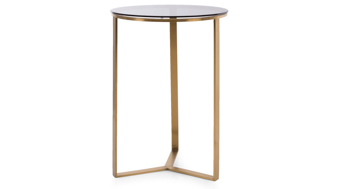 La table d'appoint Nicolo apporte une touche de luxe raffiné à tout espace. Avec sa structure élégante en acier inoxydable à la finition laiton chaleureuse et son plateau en verre fumé trempé de 6 mm, elle allie modernité et charme intemporel.