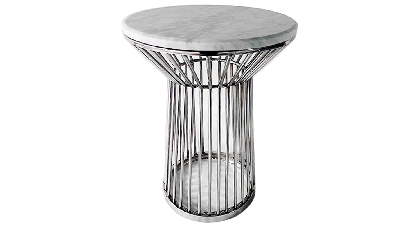 La table d'appoint Oasis allie une élégance intemporelle à un design contemporain. Son plateau en marbre blanc mat de 15 mm repose sur un élégant piètement en acier inoxydable chromé poli, créant ainsi un élément de décoration idéal pour les intérieurs modernes.