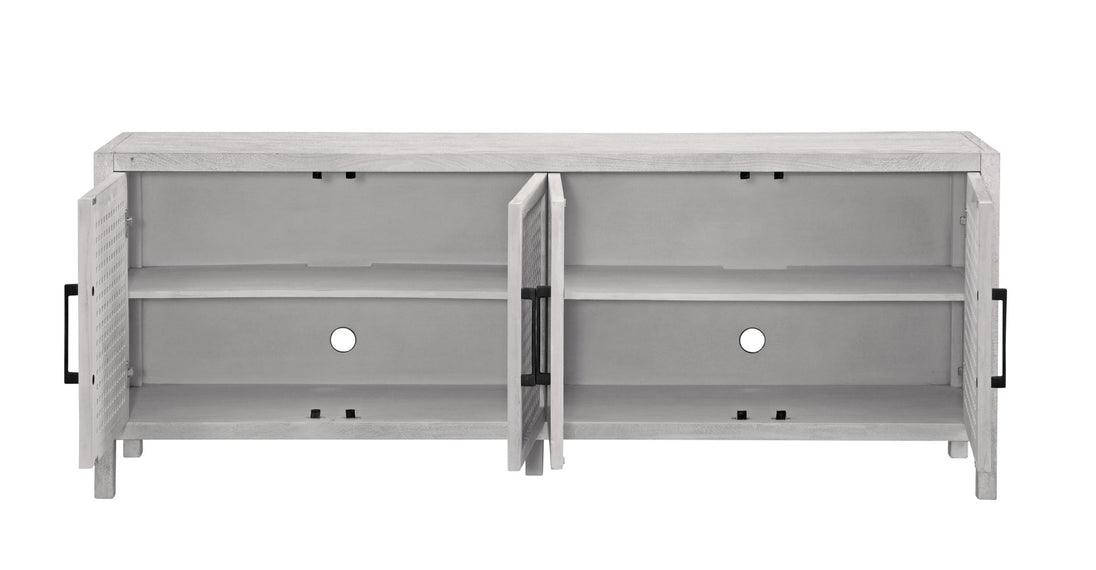 The Pentak White Server brings a blend of modern and coastal vibes to your space. Crafted from white-wash mango wood, it features soft-close door hinges and matte black iron bar door pulls for added convenience and style. With four doors adorned with open pierced fretwork detailing, this server offers ample storage space along with two fixed interior shelves and media cable management. Each piece of mango wood is unique, showcasing natural variations in color, density, grain, and finishing. With its modern coastal design and neutral color palette, the Pentak White Server is sure to complement any space.