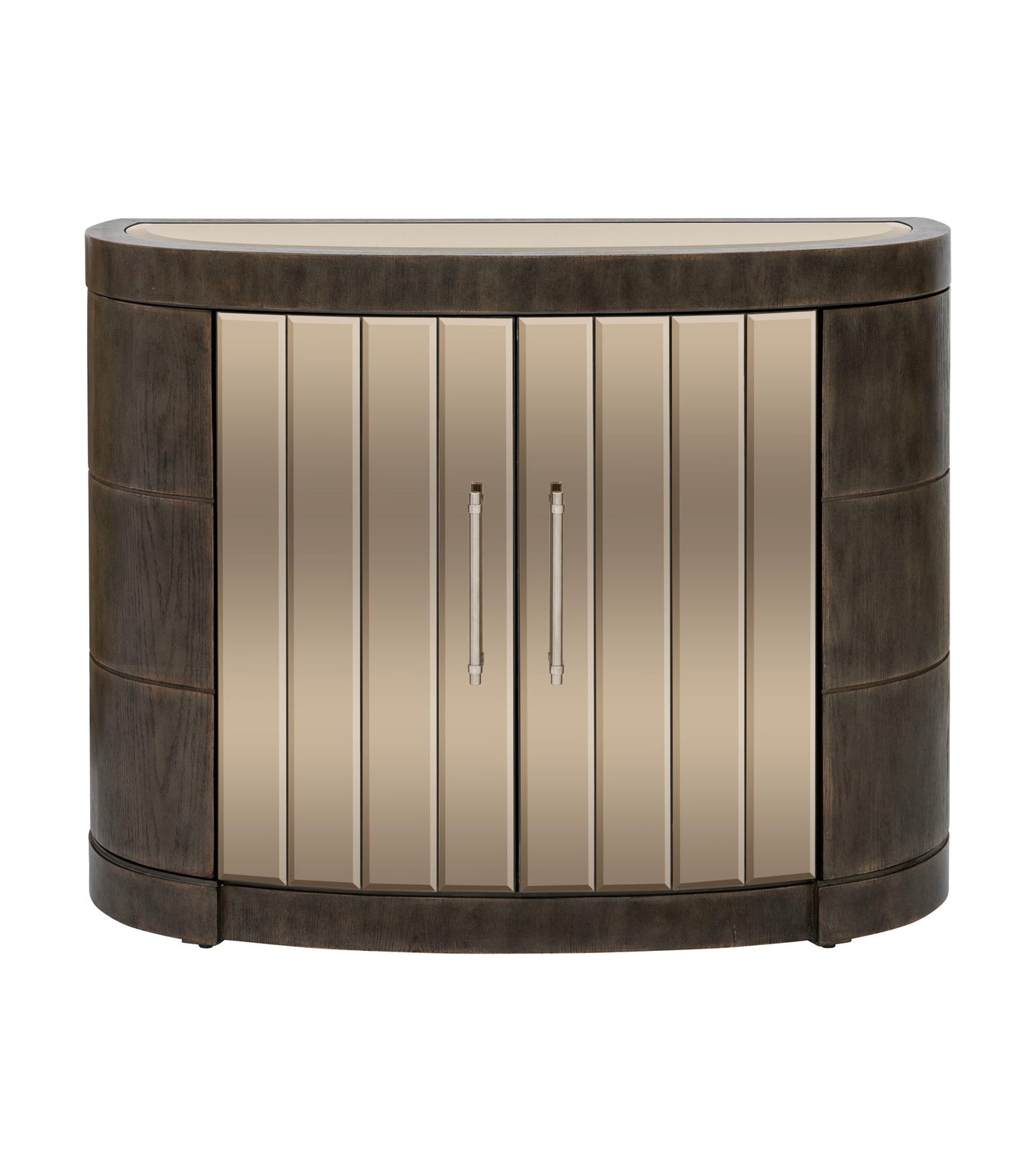 The Serrano Accent Cabinet blends rustic charm with modern elegance in its unique design. Crafted with a demilune-shaped frame of lightly distressed oak veneers in a rich chocolate brown finish, it exudes warmth and sophistication. The bronze-tinted beveled mirrors on the doors and top add a touch of glamour. Inside, four doors open to reveal six adjustable shelves, offering ample storage with a stylish flair.
