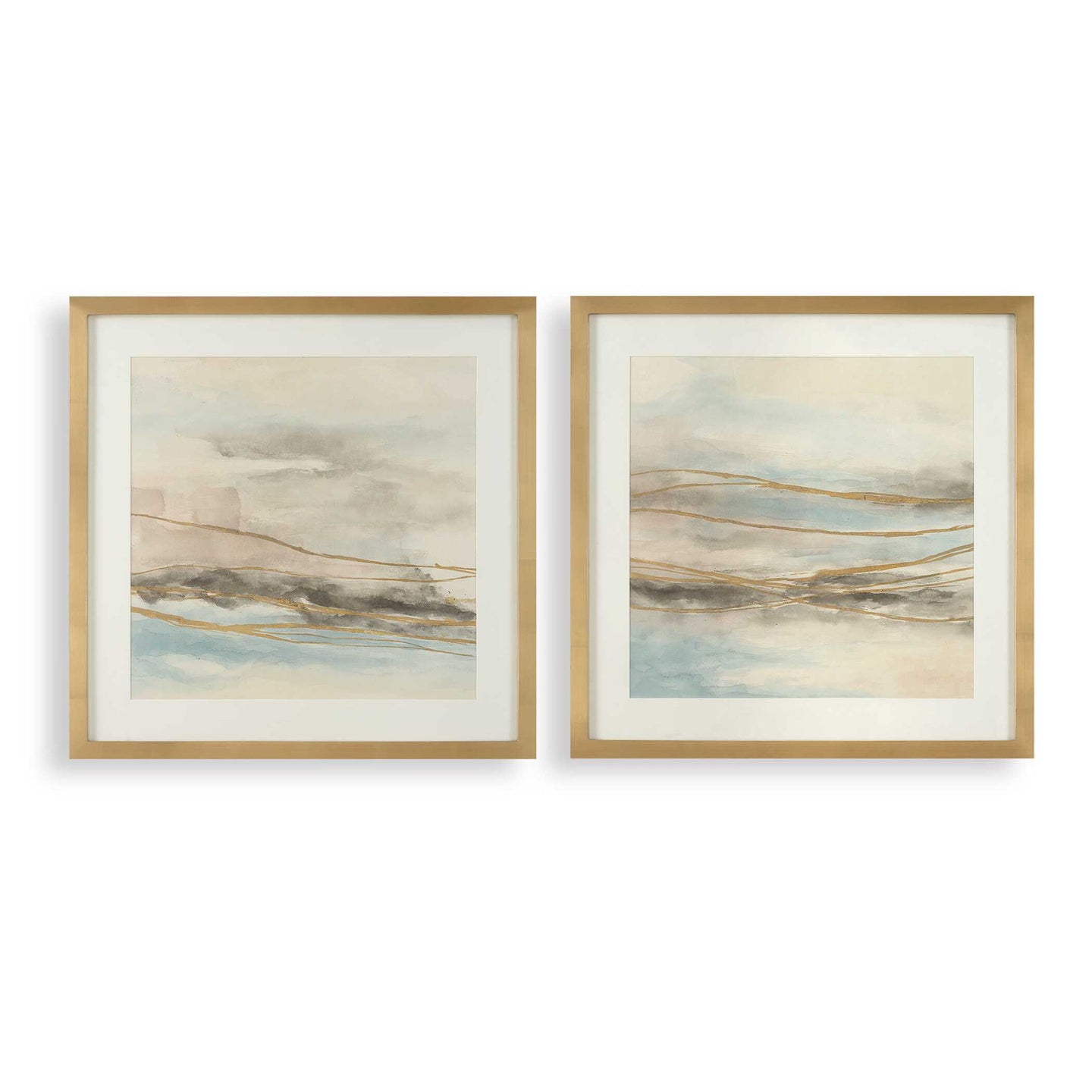 This Set Of Hand Painted Watercolors Features A Serene, Pastel-toned Background Traversed By Delicate Hand Embellished Gold Lines. The Subtle Color Palette Is Enhanced By A White Paper Mat And A Minimalist Gold Frame, With Both Pieces Preserved Behind Protective Glass. Due To The Handcrafted Nature Of This Artwork, Each Piece May Have Subtle Differences.