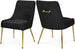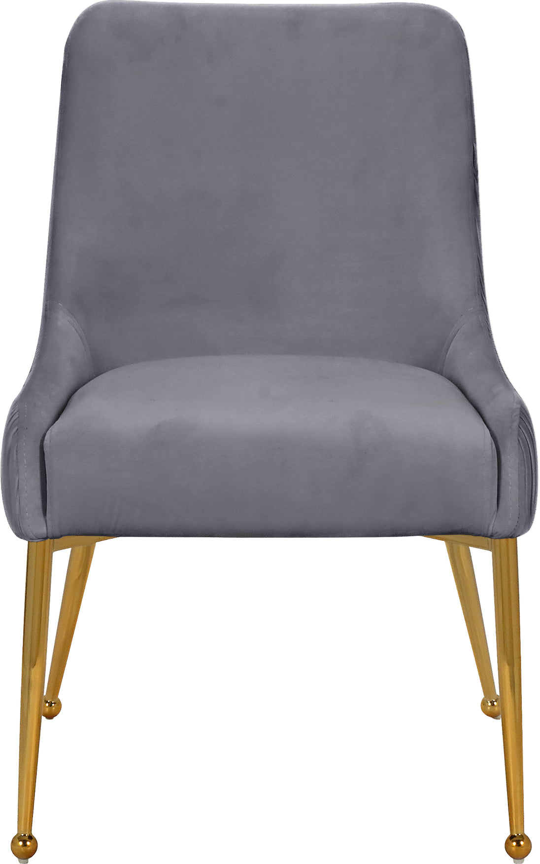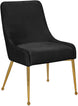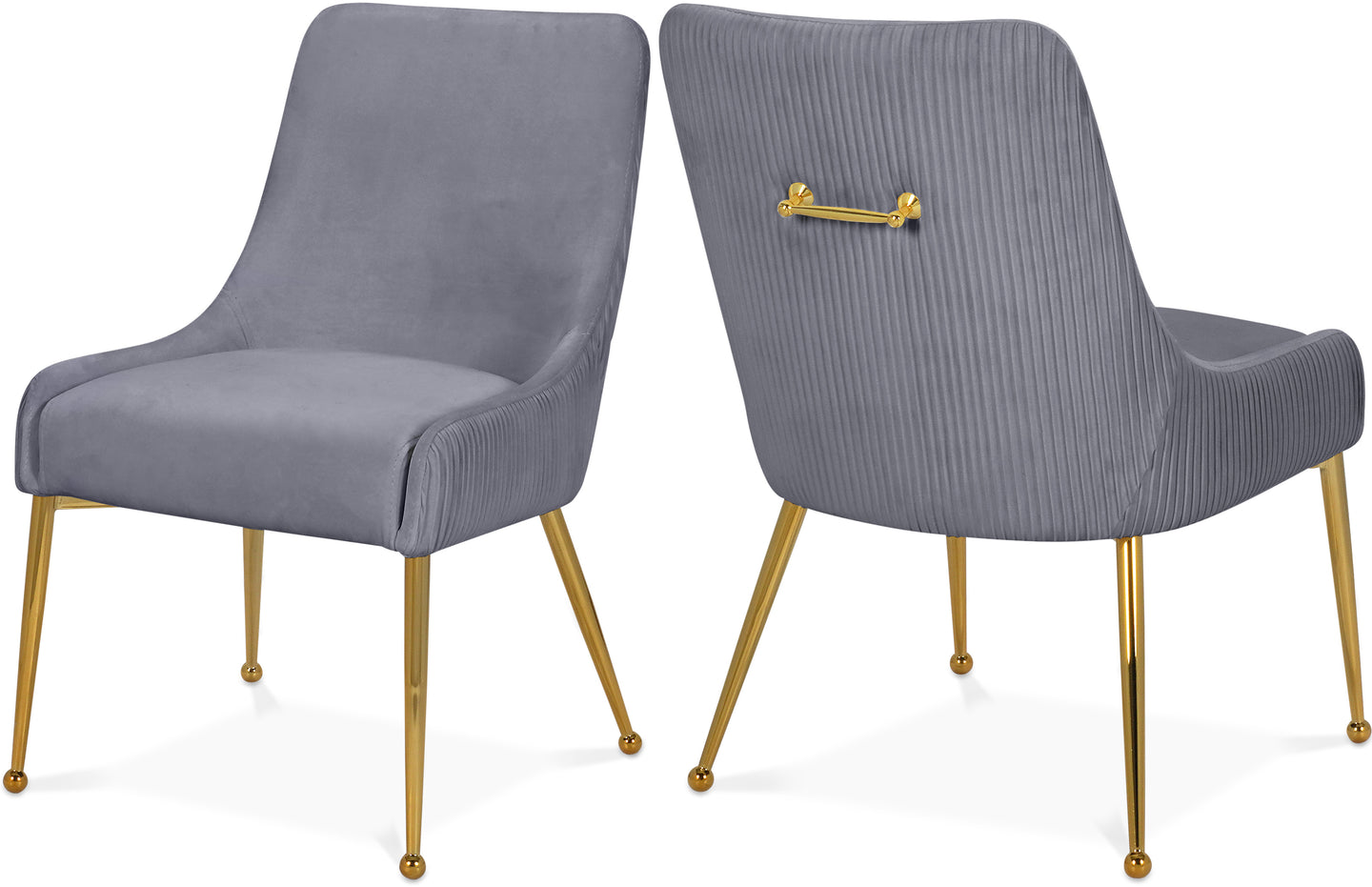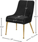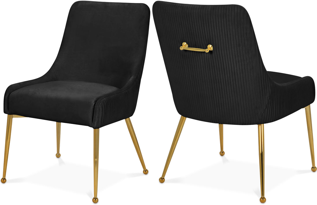 Elegance invades your dining room when you add this Ace velvet dining chair to the mix. This beautiful chair features the bells and whistles you need to take your dining room to the next level decoratively. The chair is outfitted in soft black velvet upholstery with a pleated design for added textural appeal. Polished gold legs with ball feet and a matching gold handle on the back round out the design on a stylish note.