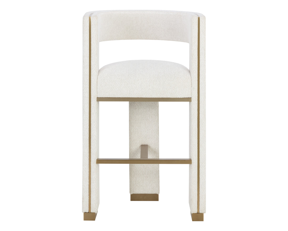 Perfectly poised with a distinct three-legged design, the Adamina Barstool will leave a lasting impression. Powder-coated gold metal detailing enhances the plush texture of our rhea light barley performance fabric for a stylish seating solution. Performance fabric is moisture repellent, durable and easy to clean.