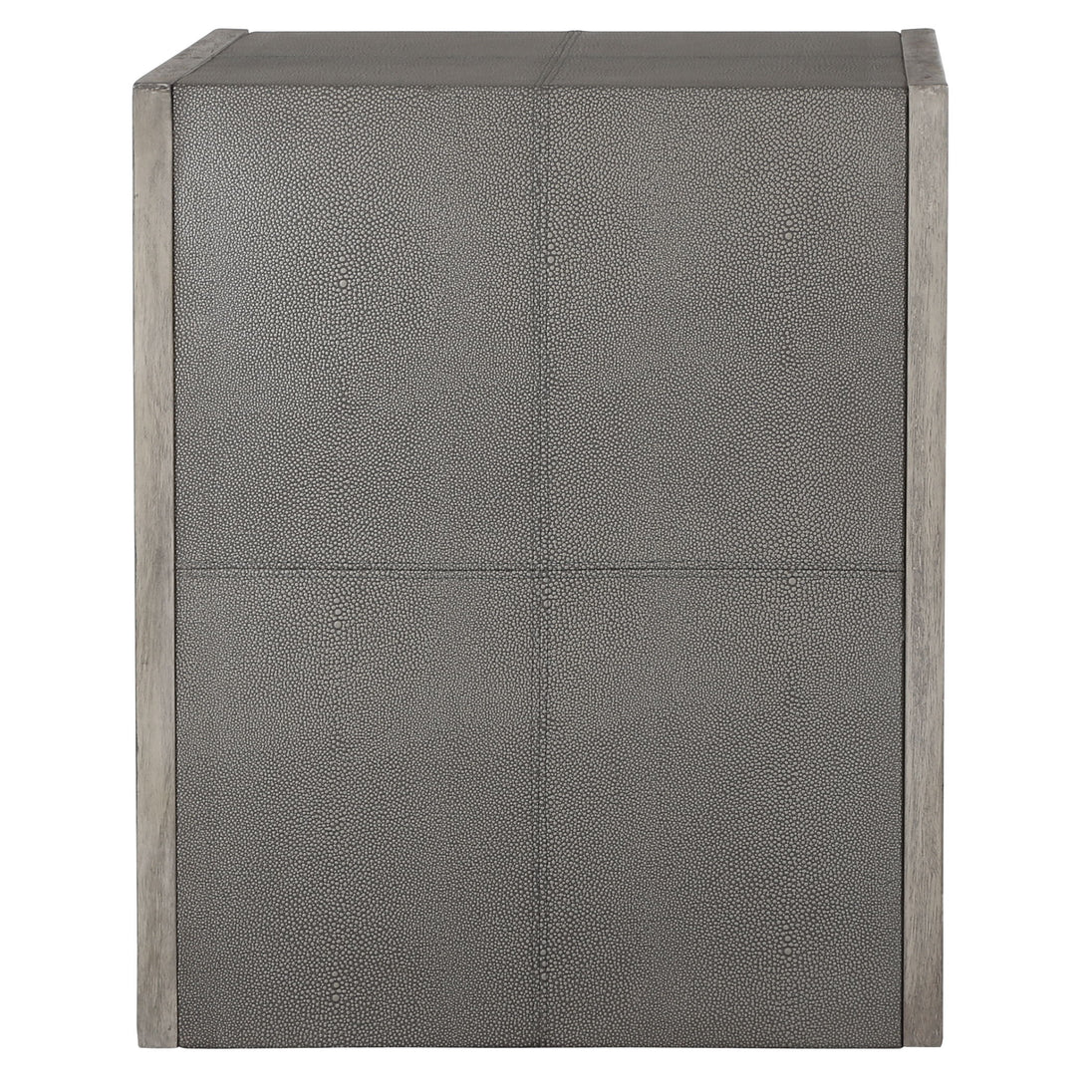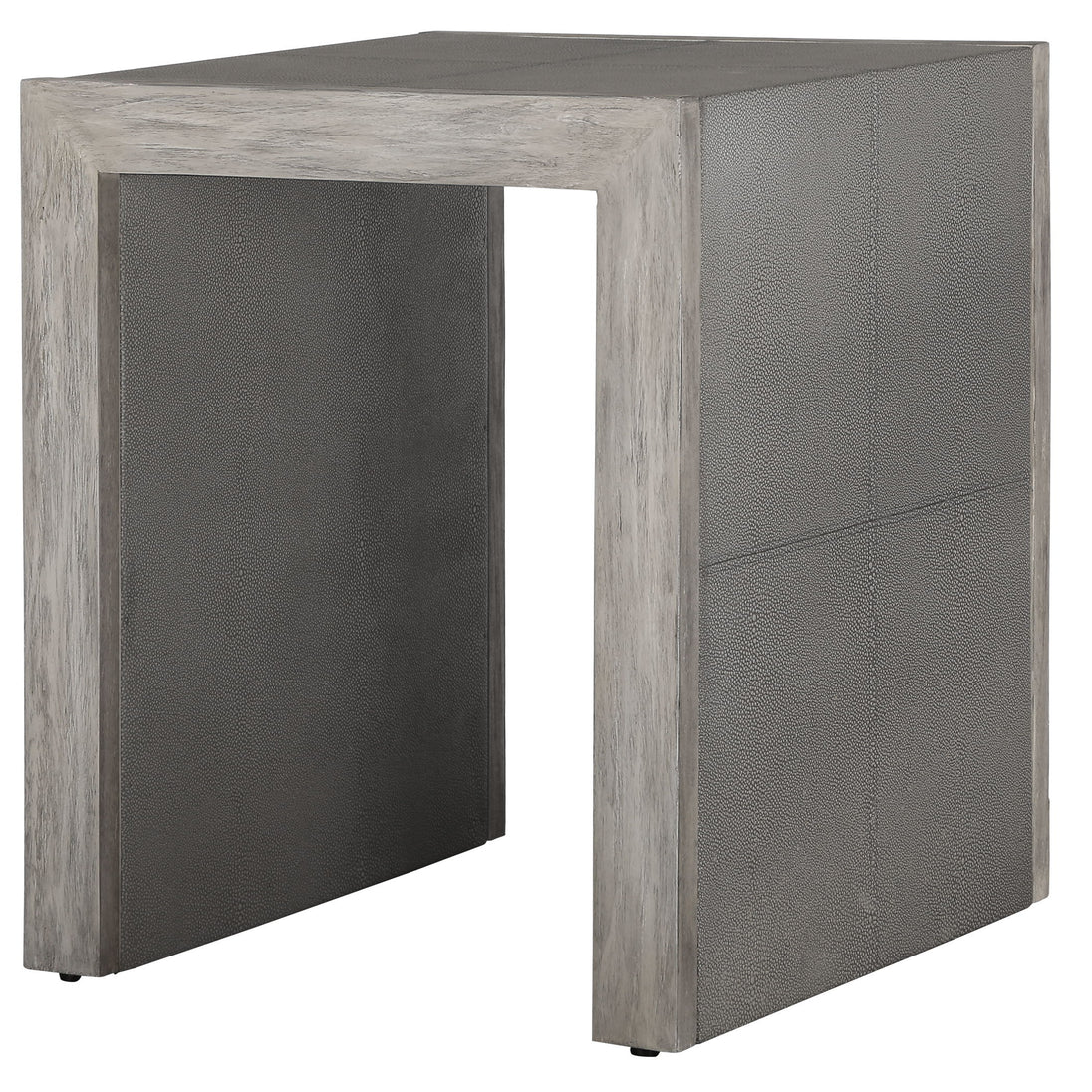 With Modern Elements, This Transitional Side Table Features Stitched Panels Of Light Gray Faux Shagreen, Paired With A Contrasting Wood Finish In A Aged White With Gray Distressed Details.Product Features