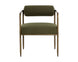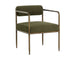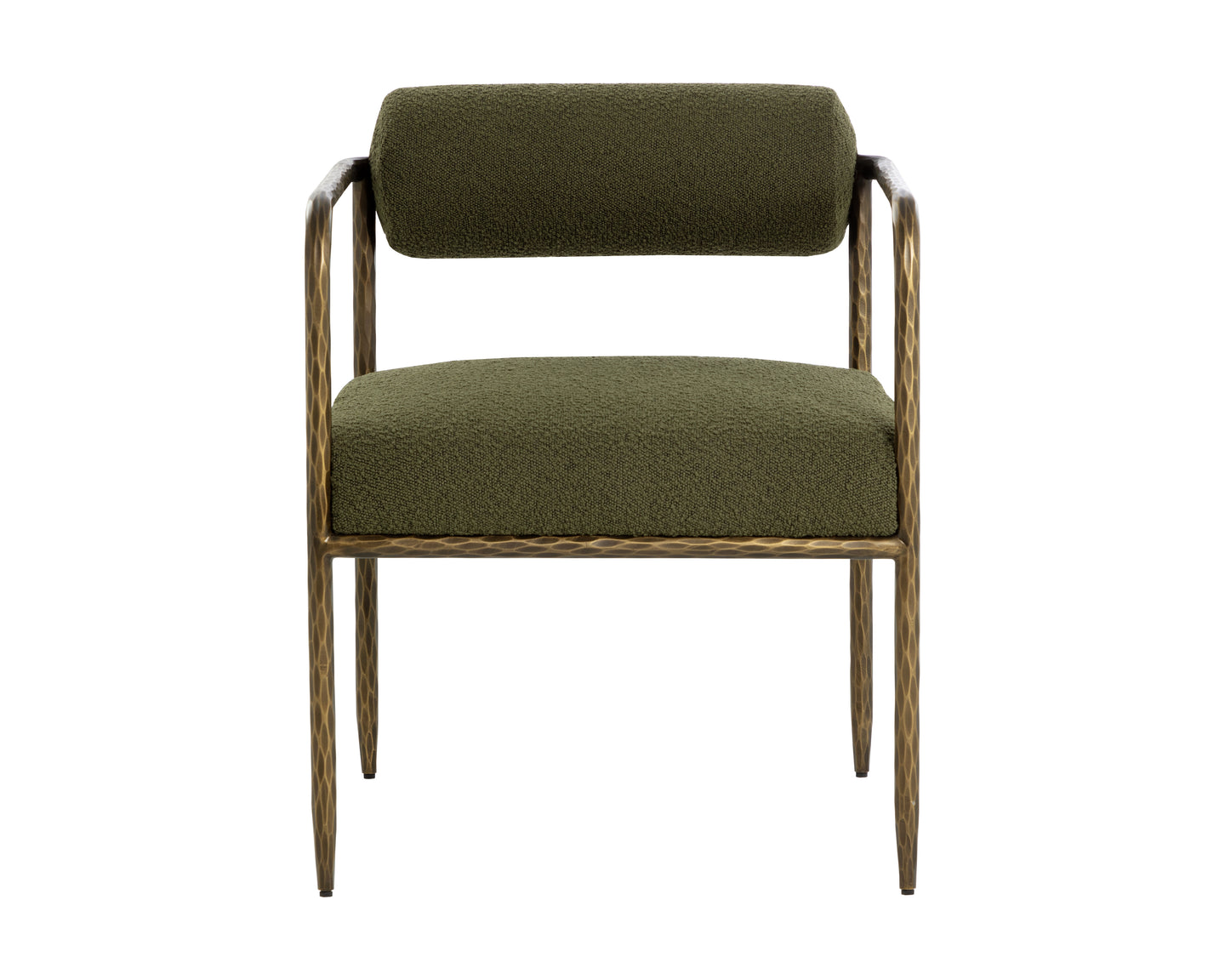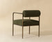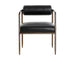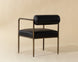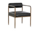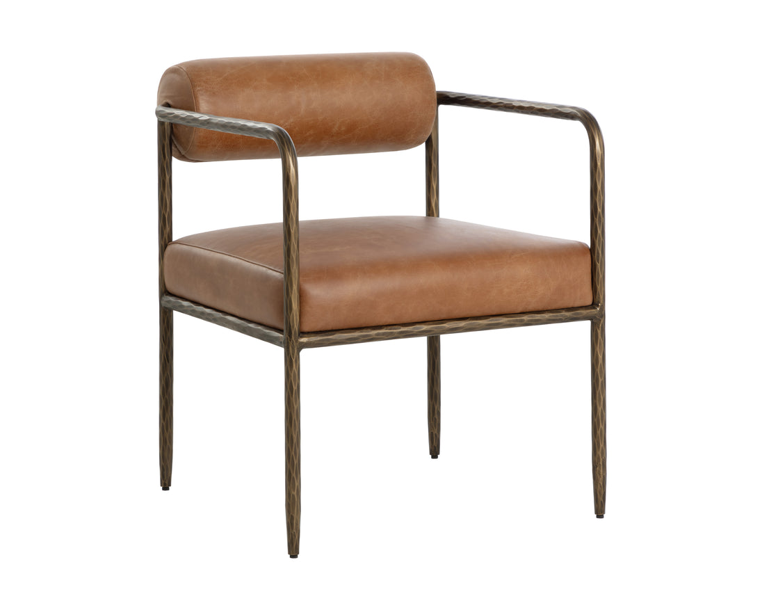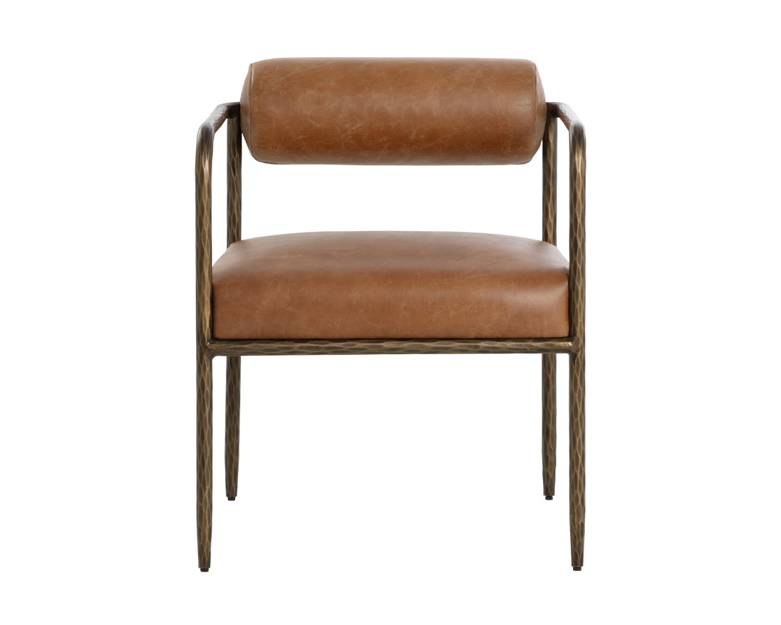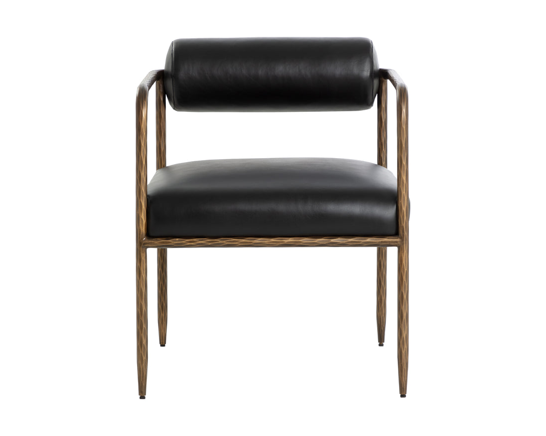 The simple frame of the Ajani Dining Armchair lets the finer details do the talking. Crafted from iron with a hand-hammered finish, this piece showcases a distinctly textured look. Charcoal black leather and a bolster back add the perfect touch of comfort, making it a great dining room addition.