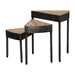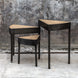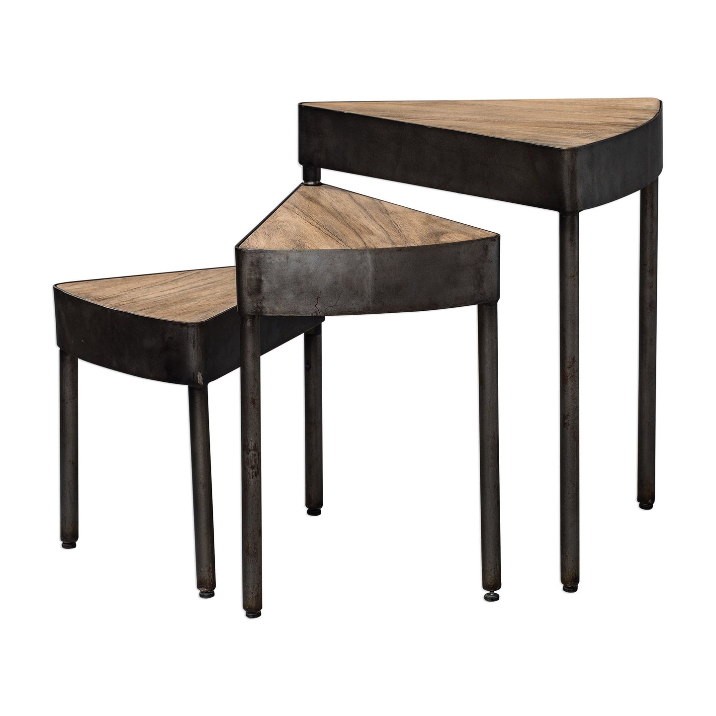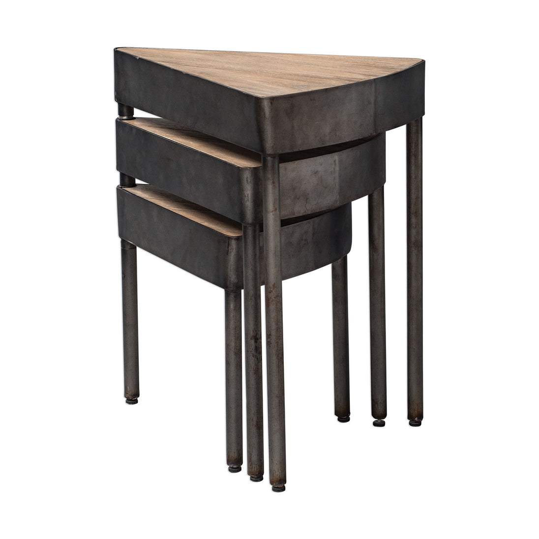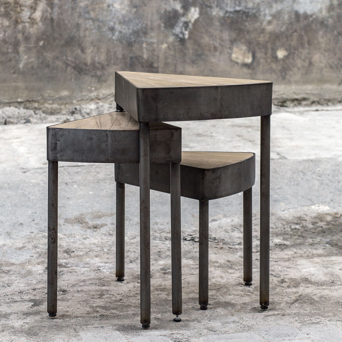 Featuring Versatile Functionality, This Contemporary Nesting Table Design Features Swivel Action Allowing You To Create The Shape With Three Tabletops. Mindi Veneer Tops Are Finished In A Natural Wheat With Thick Aged Steel Finished Supports. S- 12"x 15"x 15", M- 14"x 19"x 17", L- 16"x 24"x 20"Product Features
