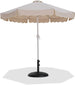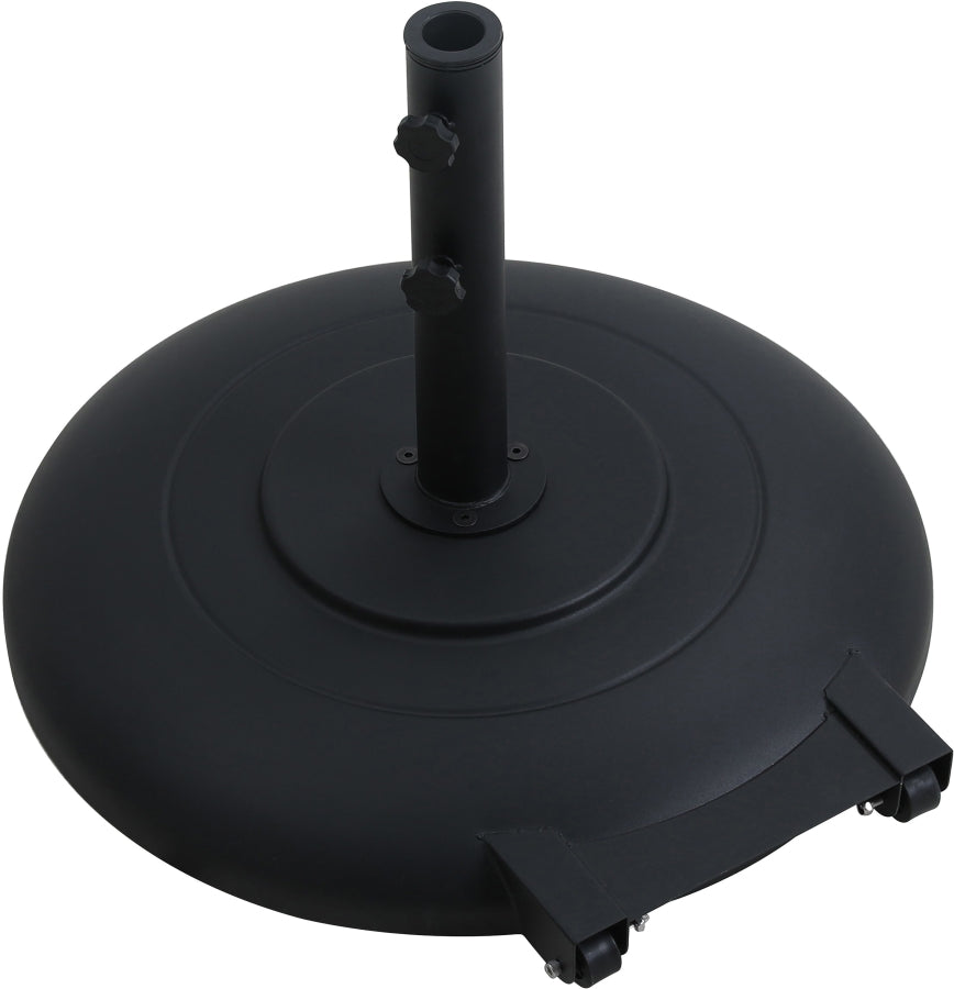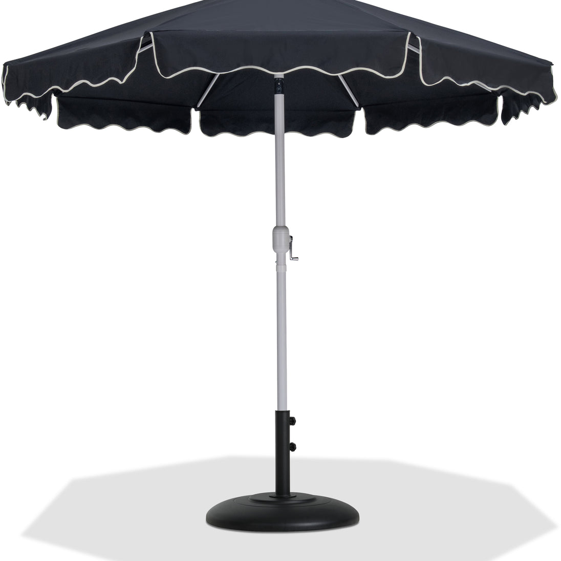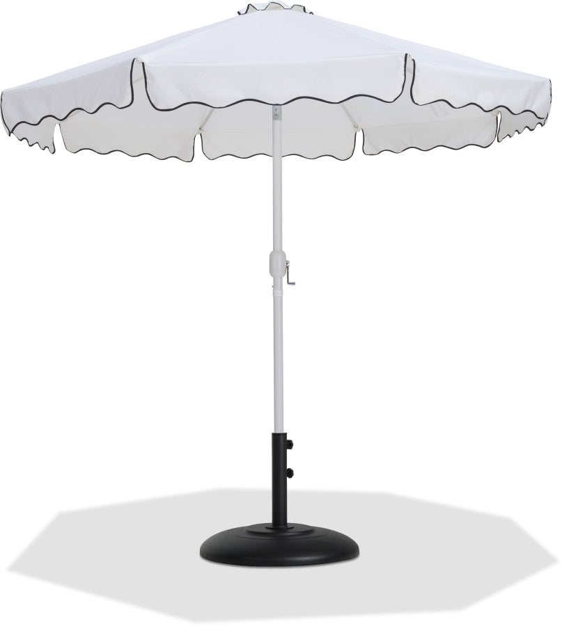 Escape from the sun's rays when you're basking beneath this Amalfi black fabric with cream piping and matte white aluminum patio umbrella with matte black base set. This umbrella and stand is an ideal option for adding shade to any area of your deck or patio. The aluminum pole weathers the elements with ease and is finished in matte white for a resort-inspired look. The umbrella's fabric is water and color-fade-resistant, ensuring lasting beauty in your outdoor space.