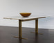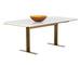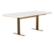This intriguing dining table will bring art deco styling to dining spaces. Crafted with a beautiful white marble top featuring rounded edges and a contemporary antique brass t-frame base. Seats up to six. As marble is a natural material, unique veining, pitting, fissures, micro-cracks and colour variations are all characteristics that add to the uniqueness and beauty of each piece.
