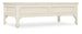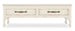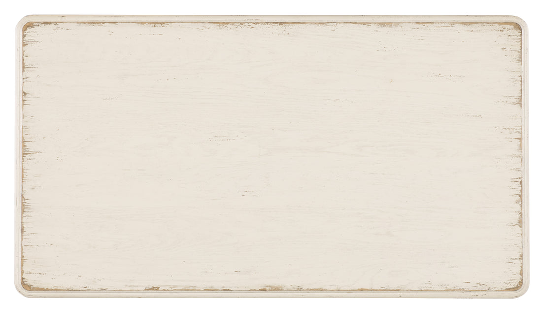In a classic, charming design with a nostalgic flair, the 58W x 32D rectangle-shaped Americana Cocktail Table has scalloped shaped legs and is finished in the time-worn white Daisy over Cathedral Oak Veneers. The finish represents the natural wear one might expect of pieces passed down through the family over time, revealing the rich oak character beneath. The table has a Solid-Wood Edge top, two self-closing drawers with drawer interiors in the Honey finish and metal alloy bar pulls in an antique bronze finish.