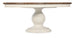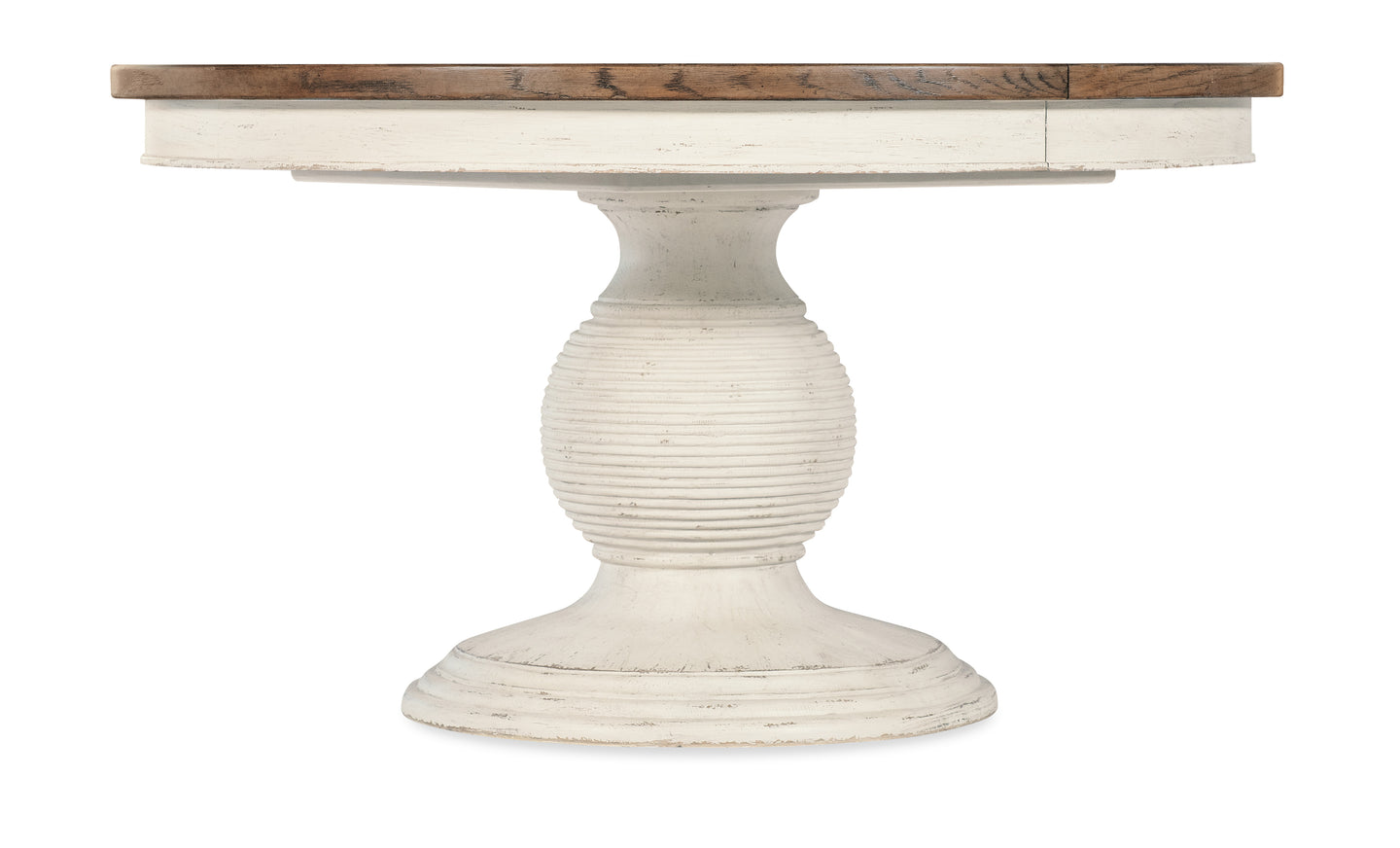 Combining the time worn white Daisy finish on the base and the warm Honey finish in a soft brown tone on the top, the Americana Round Pedestal Dining Table harkens back to a simpler, more genteel time. Crafted of Oak Veneers with a Solid-Wood Edge Top, it has a carved pedestal base. With the 22-inch leaf in place, the table extends to 76 inches round and accommodates up to two coordinating benches and two armchairs and up to 8 coordinating armchairs or side chairs. Without the leaf, it accommodates up to 6 coordinating arm or side chairs.