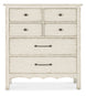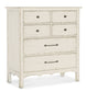 In a classic, charming design with a nostalgic flair, the Americana Six-Drawer Chest is crafted of Oak Veneers with a Solid-Wood Edge Top, a scalloped-shape base and finished in the time-worn white Daisy. The drawers are self-closing and finished on the interior in the warm Honey color. The top drawers have a black removable felt liner and the bottom drawer is cedar-lined. Metal alloy knob pulls have an antique bronze finish.