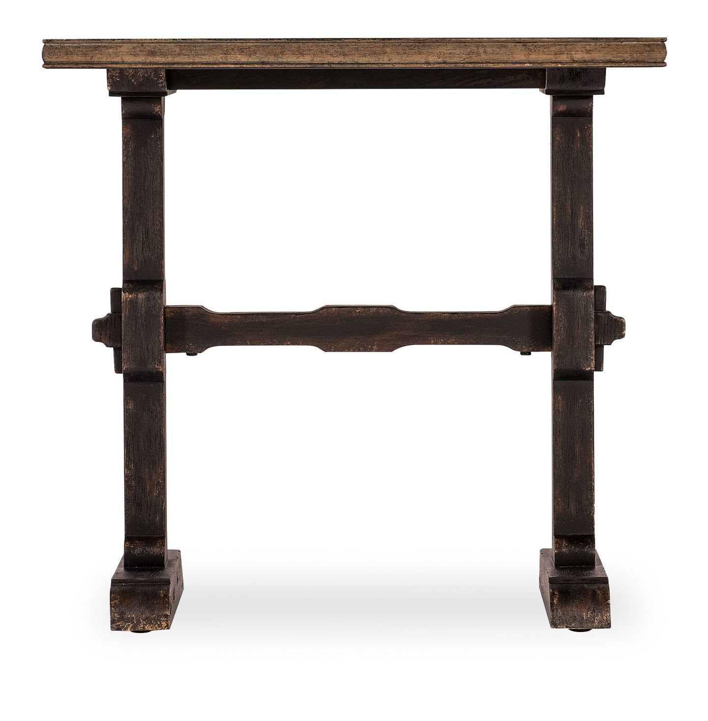 Reimagining an historical design with a fresh take on finish, function and form, the stunning Americana Trestle End Table has a two-tone finish combining a parquet Oak Veneer top design with a Molasses finish on the base. Capturing the essence of a well-loved heirloom, the deep dark Molasses tone over Cathedral Oak Veneers adds warmth, while the variations in color reveal the natural beauty of the wood beneath. The base is an interlocked carved stretcher design. Solid-wood edge top.